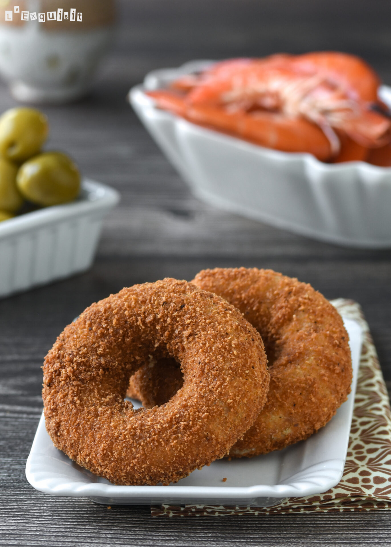 Rebozar los aros en la harina de garbanzos o el almidón, pasar por el huevo batido y rebozar con el pan rallado. En este punto se pueden freír a 190 grados durante 5 minutos o congelar.