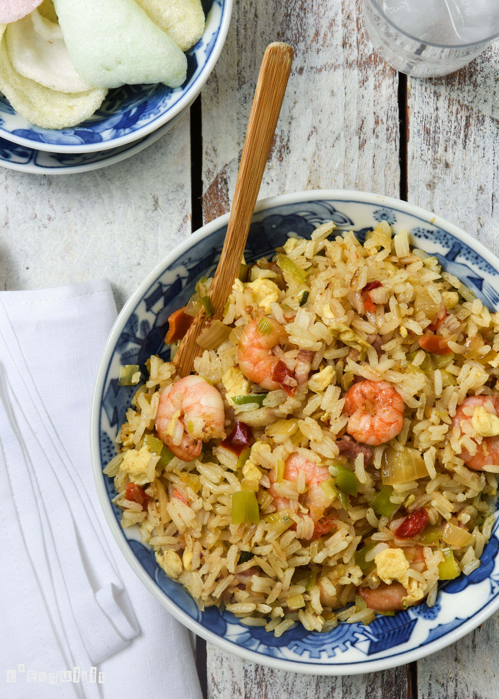 Verter el sobre de Nasi Goreng en 100 ml. de agua hirviendo, dejar reposar 10 minutos. Si utilizáis la mezcla casera, añadir directamente con el arroz.