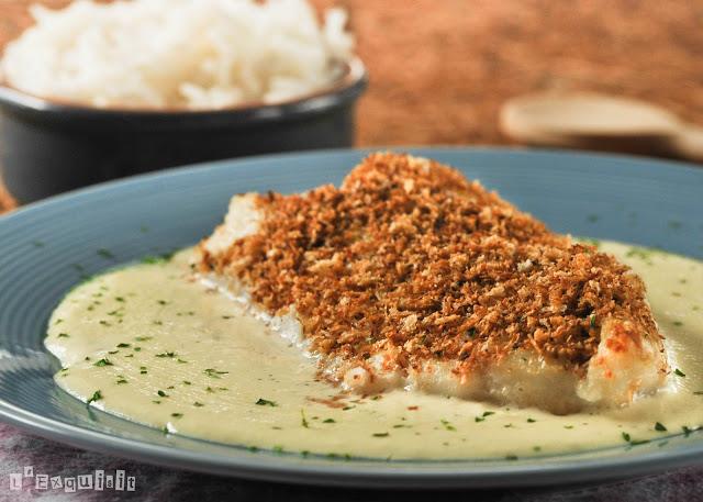 Bacalao con pan de coco sobre crema de avellanas y ajo