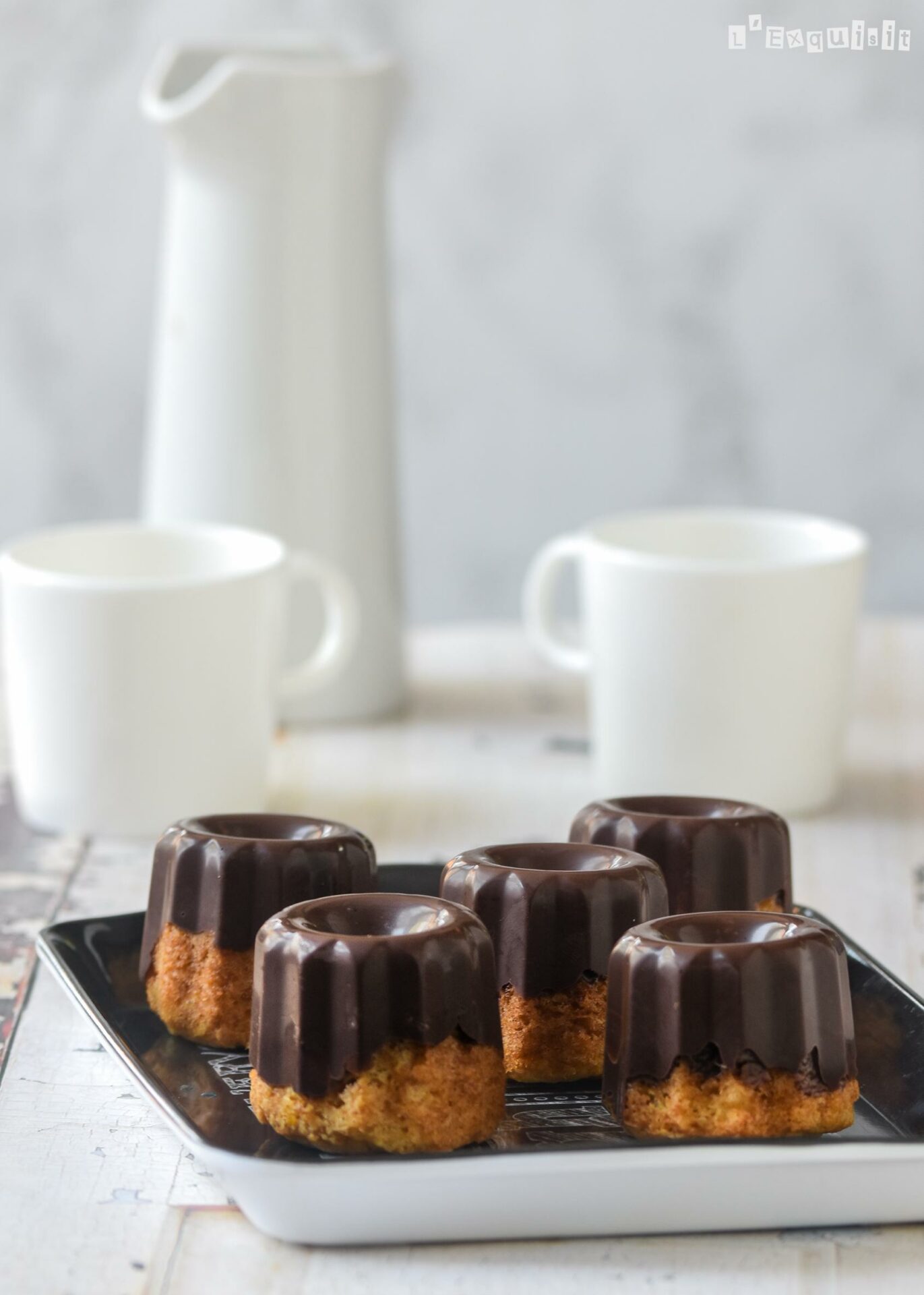 Derretir el chocolate junto al aceite de coco. Repartir en los mismos moldes (limpios y bien secos) e introducir los bizcochos. Reservar en la nevera hasta que el chocolate esté frío.
