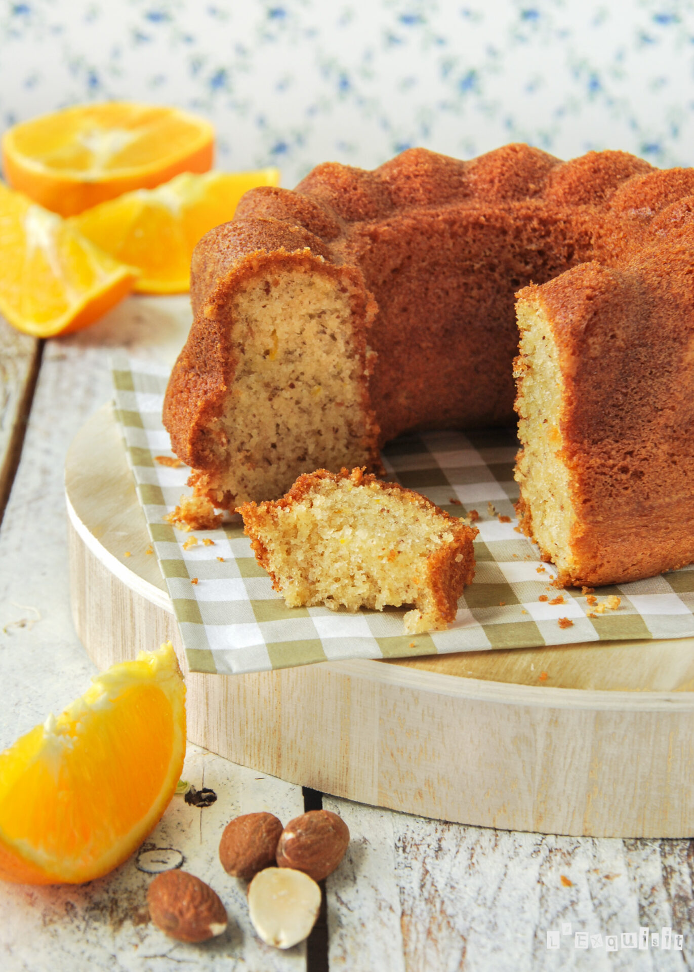 Batir los huevos con el azúcar y la ralladura de naranja hasta obtener una mezcla blanquecina. Verter, poco a poco, el aceite y seguir batiendo. A continuación verter la leche. Con la ayuda de un tamizador, agregar la harina tamizada con el impulsor y con una espátula, incorporar poco a poco las almendras y la canela.