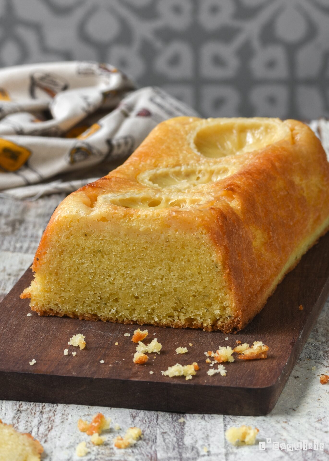 Disponer las rodajas de limón en el fondo del molde, forrado con papel sulfurizado, y verter la mezcla encima. Hornear a 160 grados durante 45 minutos, hasta que al introducir un palillo en el centro, éste salga limpio. Retirar del horno, esperar 10 minutos y desmoldar, quedando las rodajas de limón en la parte superior. Dejar enfriar completamente encima de una rejilla.