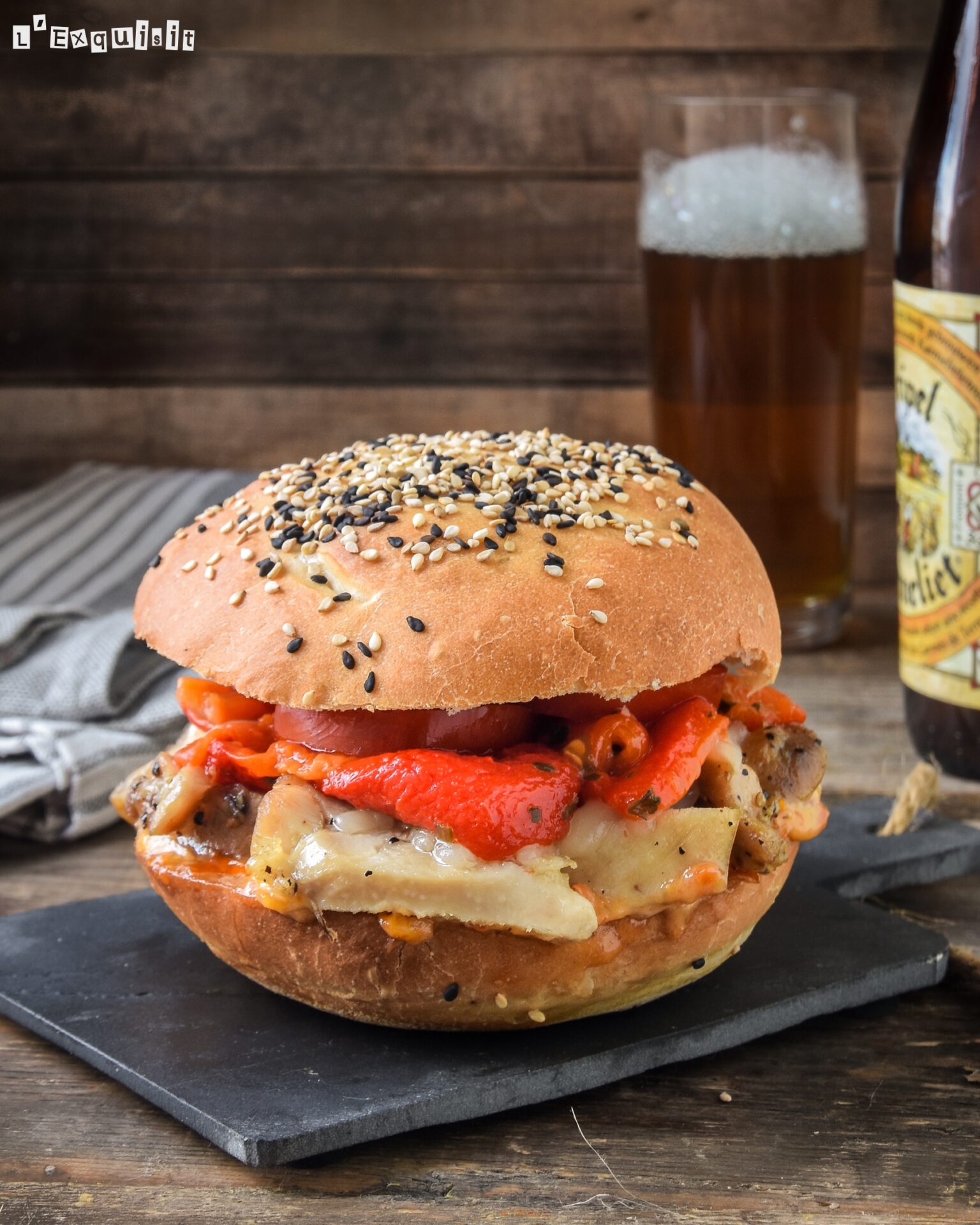 Tostar el pan abierto en la sartén grill. Repartir la mezcla de tomates en una mitad. Disponer el pollo encima, la albahaca y el queso. Devolver a la sartén, tapar y cocinar hasta que el queso se derrita, la base del pan quedará crujiente. Repartir el tomate cortado y el pimiento, tapar con la otra mitad del panecillo y servir inmediatamente.