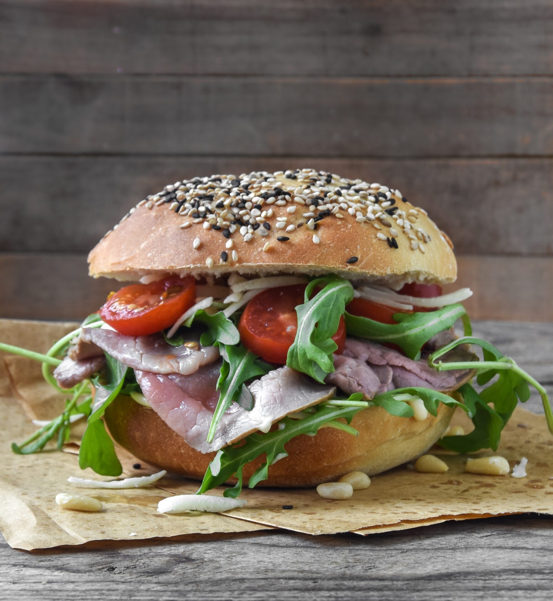 Repartir la mahonesa sobre la mitad inferior del pan. Cubrir con la leche, el rosbief salpimentado, los tomates, el queso y los piñones. Tapar con la otra mitad de pan.