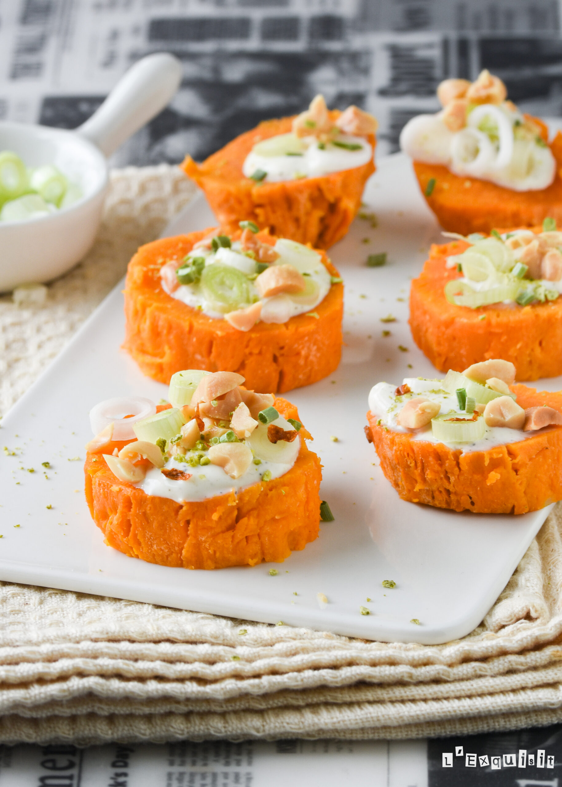 Repartir las rodajas de boniato y repartir encima la mezcla de crème fraîche, los cacahuetes, la cayena y la ralladura de lima.