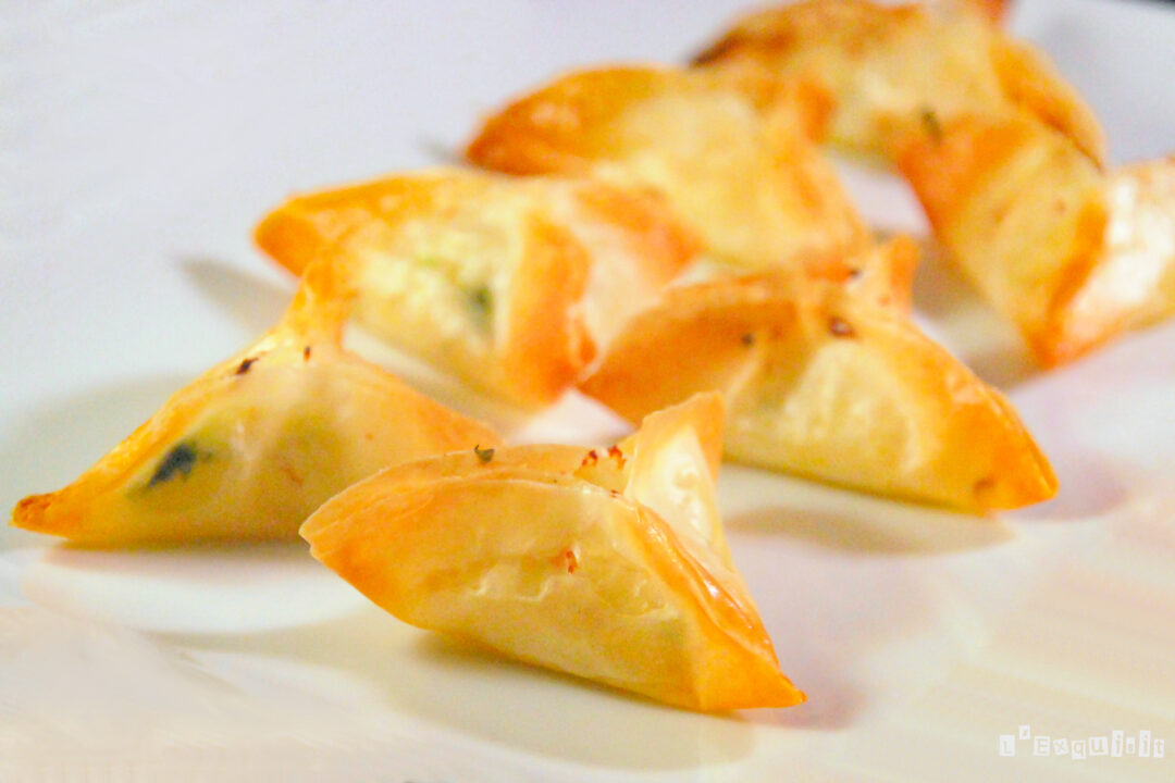 Rellenar con brandada (algo menos del tamaño de una nuez) y cerrar como se ve en la foto (con el aceite se quedan fácilmente pegados). Disponer los crujientes en una bandeja apta para horno. Continuar hasta terminar la pasta philo.