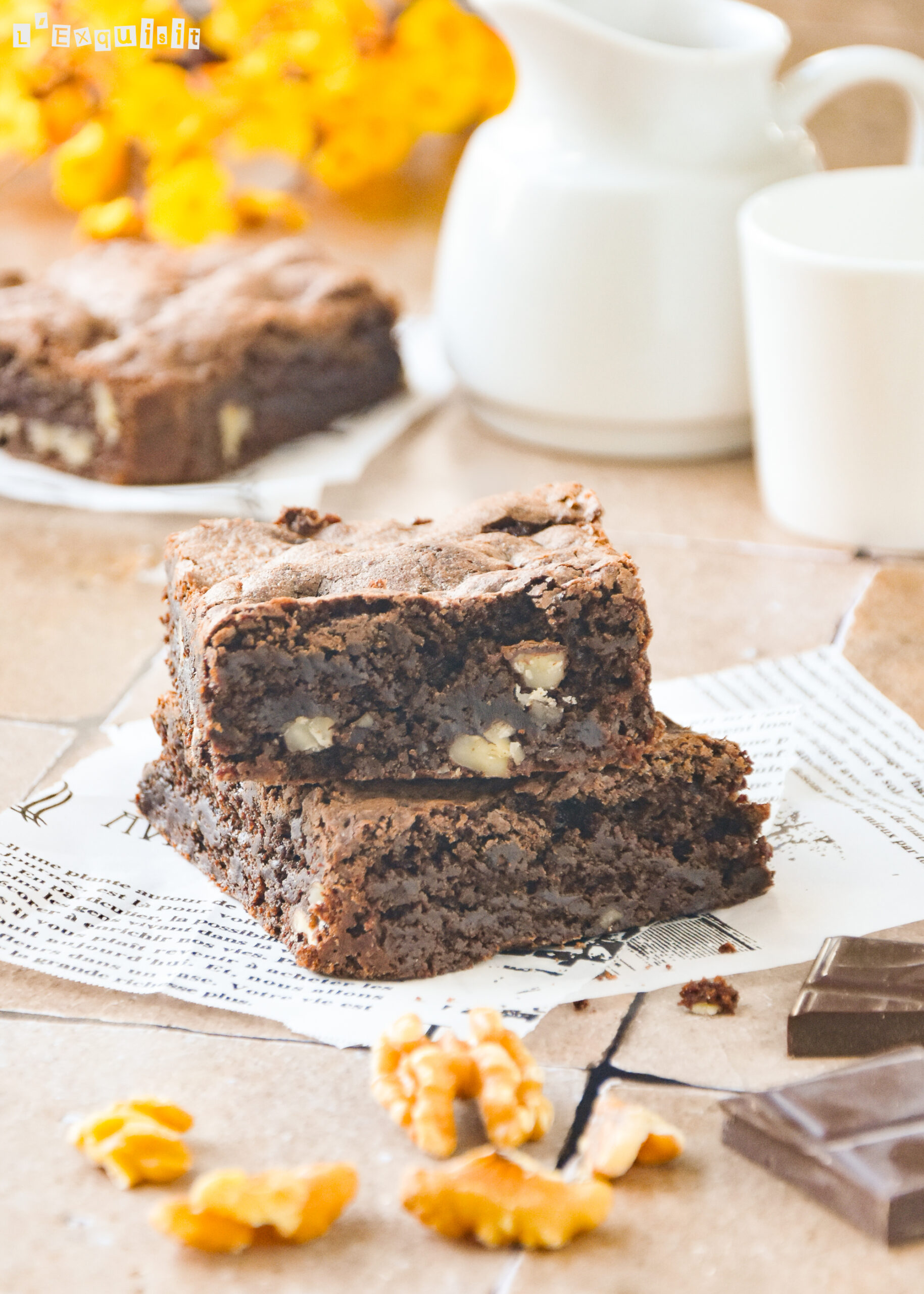 Nadie percibe en éste brownie que no lleva mantequilla como es habitual…queda jugoso y con sabor a chocolate…ideal para los que padecemos intolerancias a la leche y el gluten…