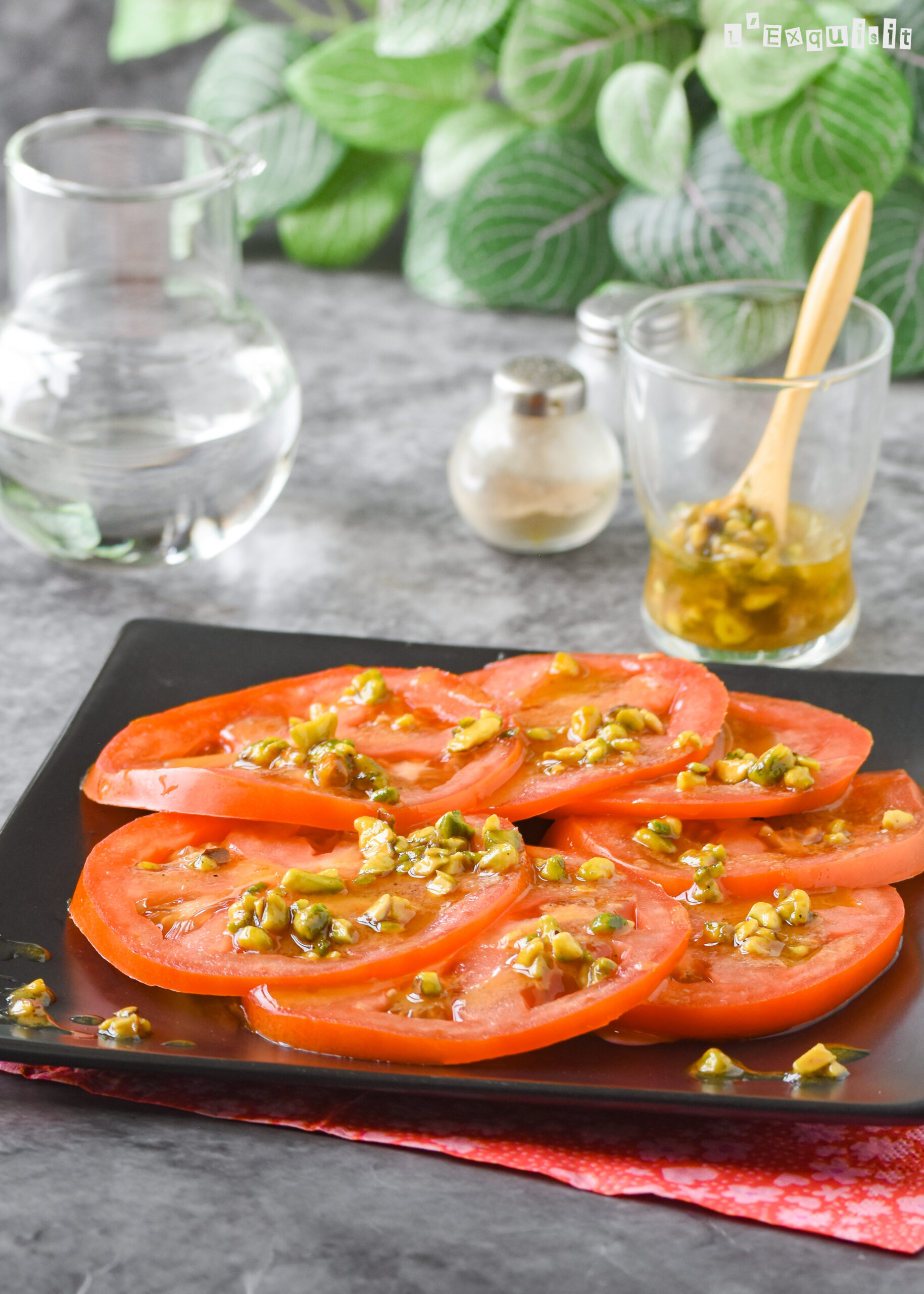 Emulsionar los pistachos con el ajo en polvo, la miel, la mostaza, el aceite y el vinagre balsámico. Salpimentar al gusto. Regar el tomate con el aliño.