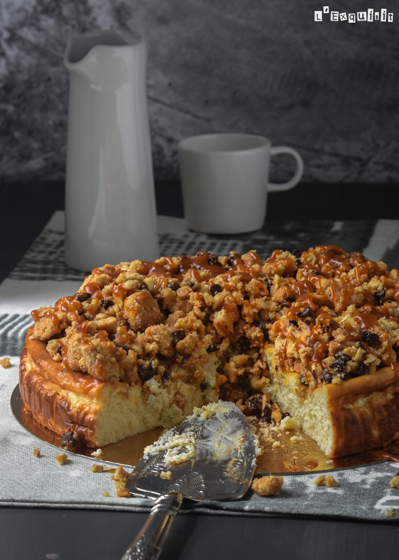 Disponer las galletas en una bolsa y aplastarlas groseramente. Mezclarlas en un bol con la mantequilla derretida. Dejar enfriar 10 minutos. Sacar el cheesecake de la nevera. Agregar a las galletas el resto de ingredientes y mezclar bien. Repartir por encima del cheesecake y verter el caramelo por encima (no todo, el resto se lo servirá cada comensal al gusto).
