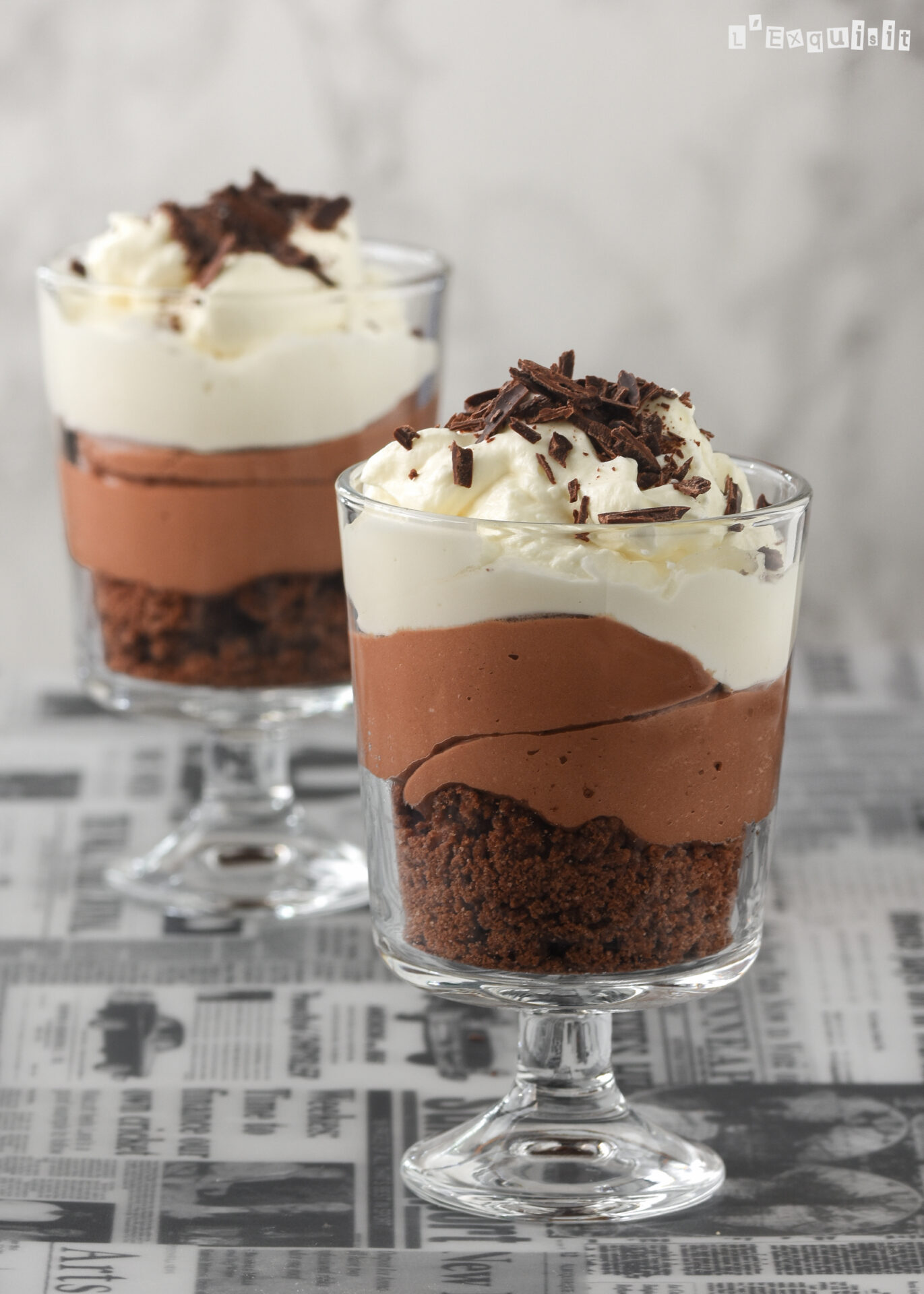 Montar la nata a punto de nieve con el azúcar glas, ponerla en una manga pastelera y terminar de cubrir las copas. Decorar con chocolate rallado.