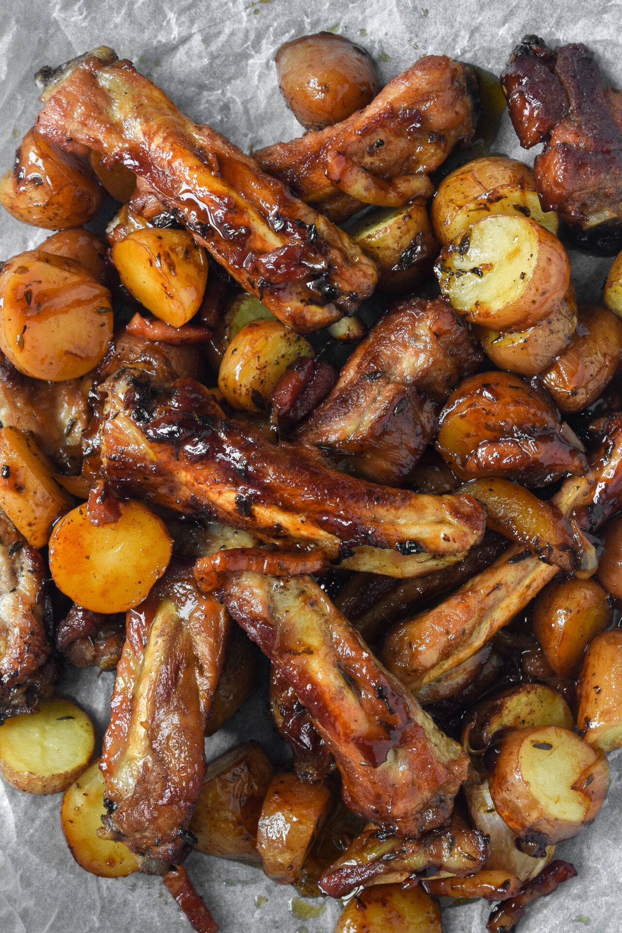Dorar las costillas con el aceite en una cazuela apta para horno. Incorporar la cebolla, el bacon y los ajos, cocinar 4 minutos. Añadir el laurel, el tomillo, el pimentón y la miel, remover y agregar las patatas y la cerveza. Salpimentar, tapar y cocinar 5 minutos.
