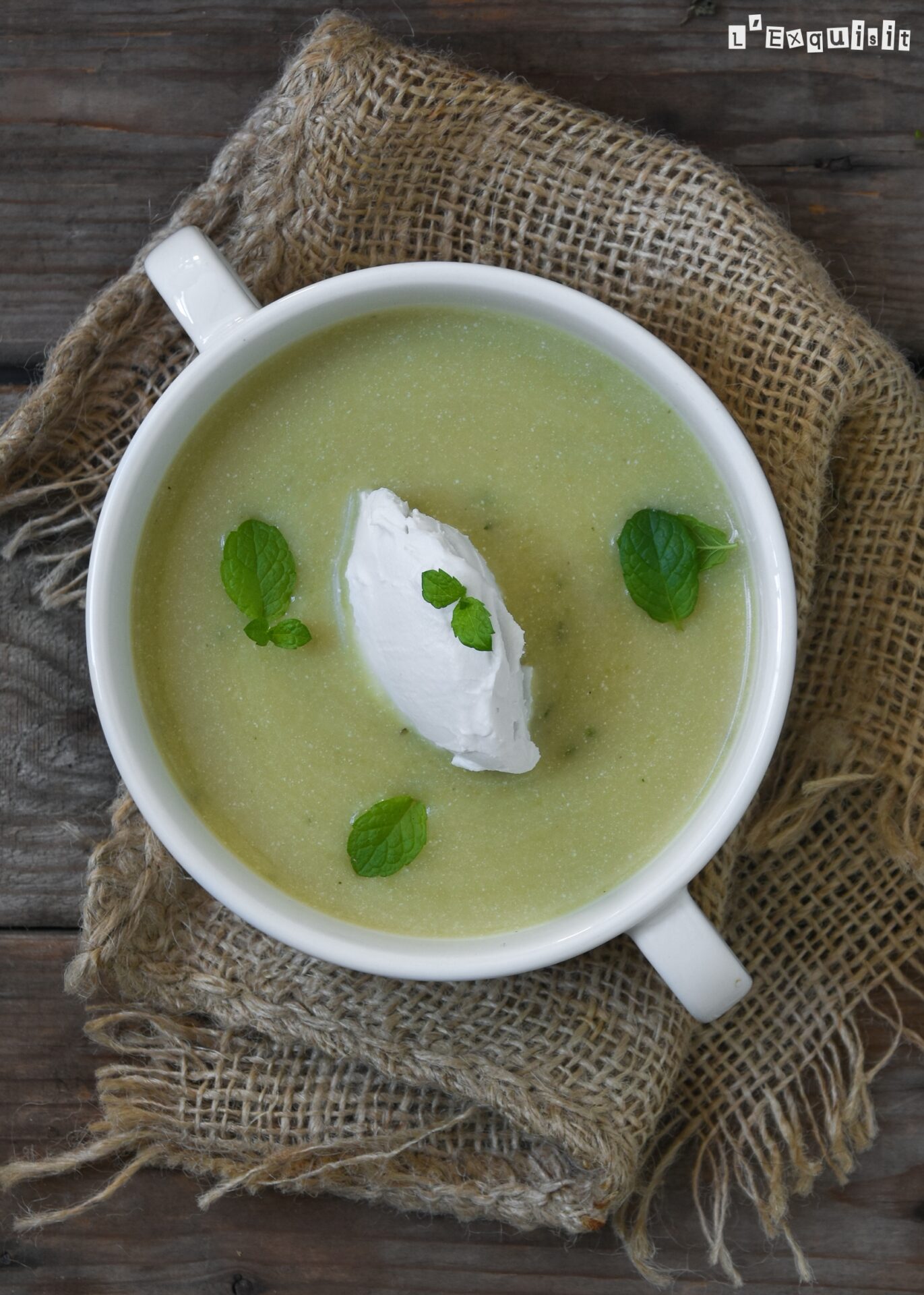 Repartir la sopa en cuencos y decorar con una cucharada de crème fraîche y el resto de menta.