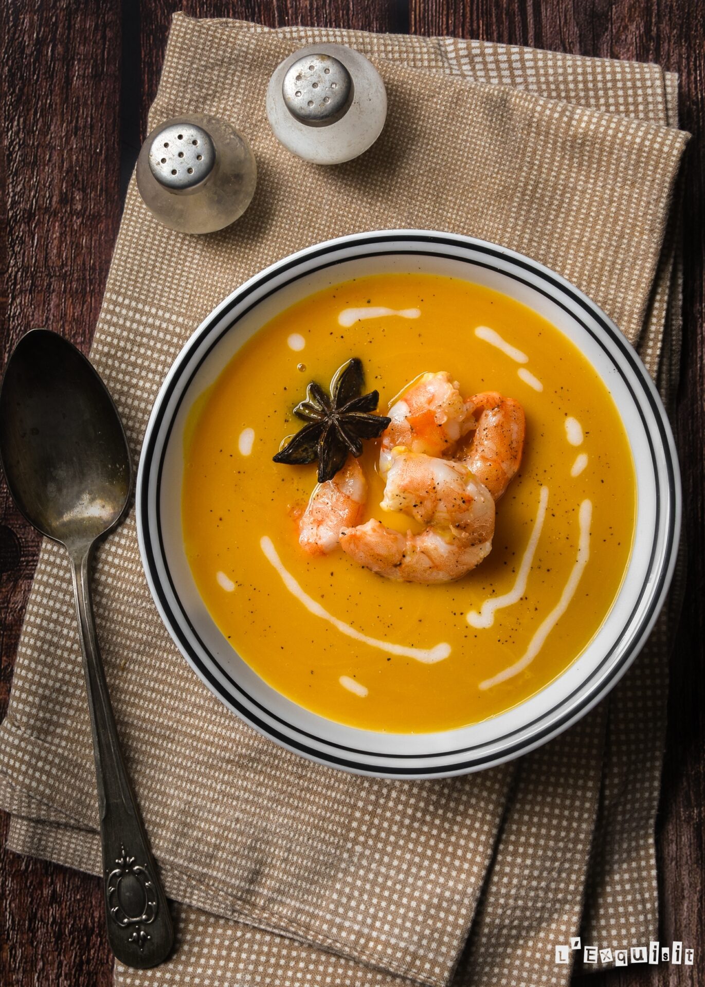La crema de hoy es muy versátil: la podéis servir con gambas para tener un plato completo o sin las gambas en vasitos para servir en una mesa de aperitivos. El toque del anís estrellado es delicioso…