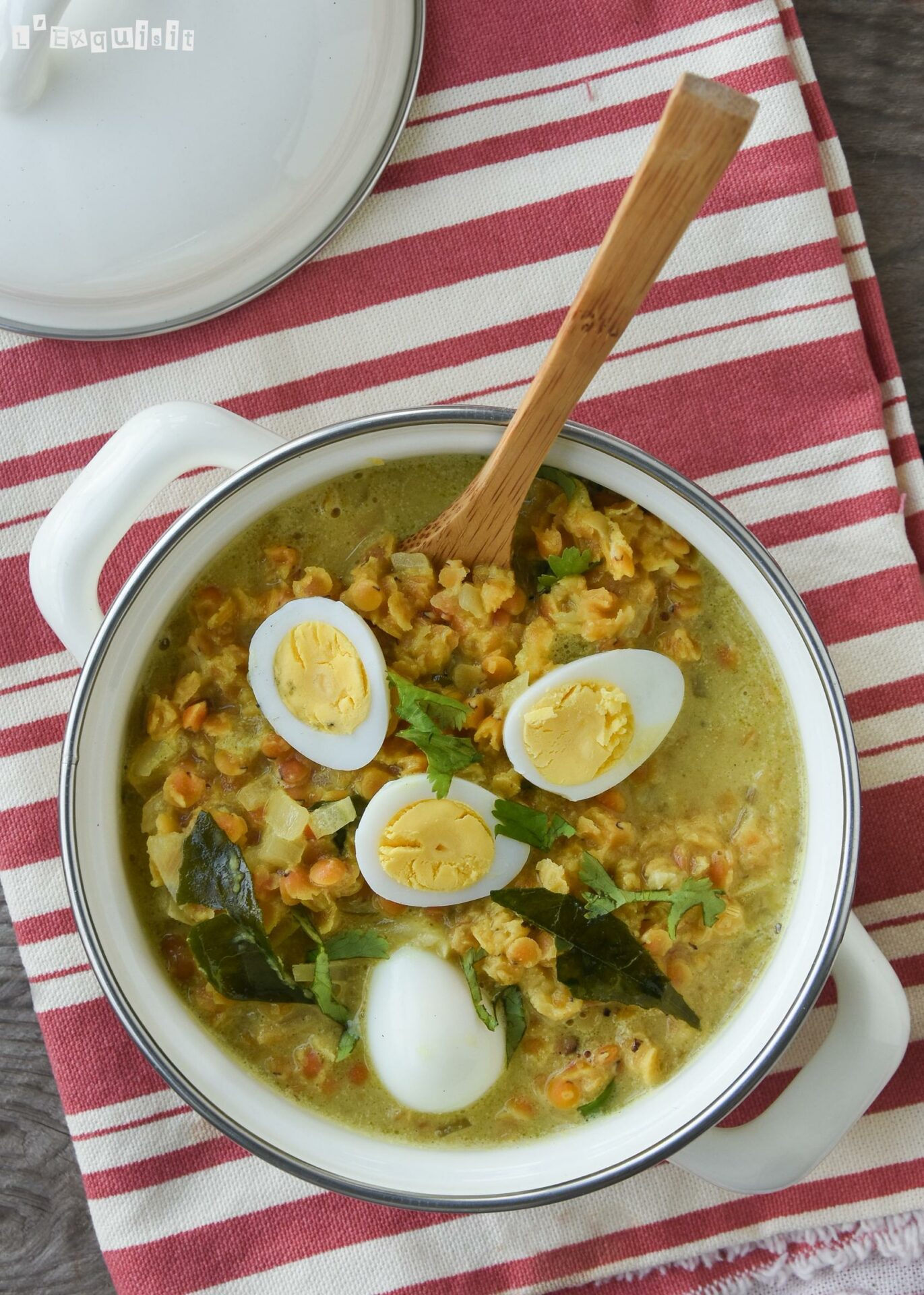 Calentar el aceite de coco en una cazuela a fuego medio. Añadir las semillas de hinojo, el comino, la mostaza, los ajos, las cebollas, la cúrcuma y las hojas de curry. Cocinar durante 2 minutos. Incorporar las lentejas, el caldo y la leche de coco. Salpimentar, llevar a ebullición, bajar el fuego y cocinar 20 minutos. Entonces agregar la crème fraîche y la pimienta negra. Cocinar 5 minutos más.