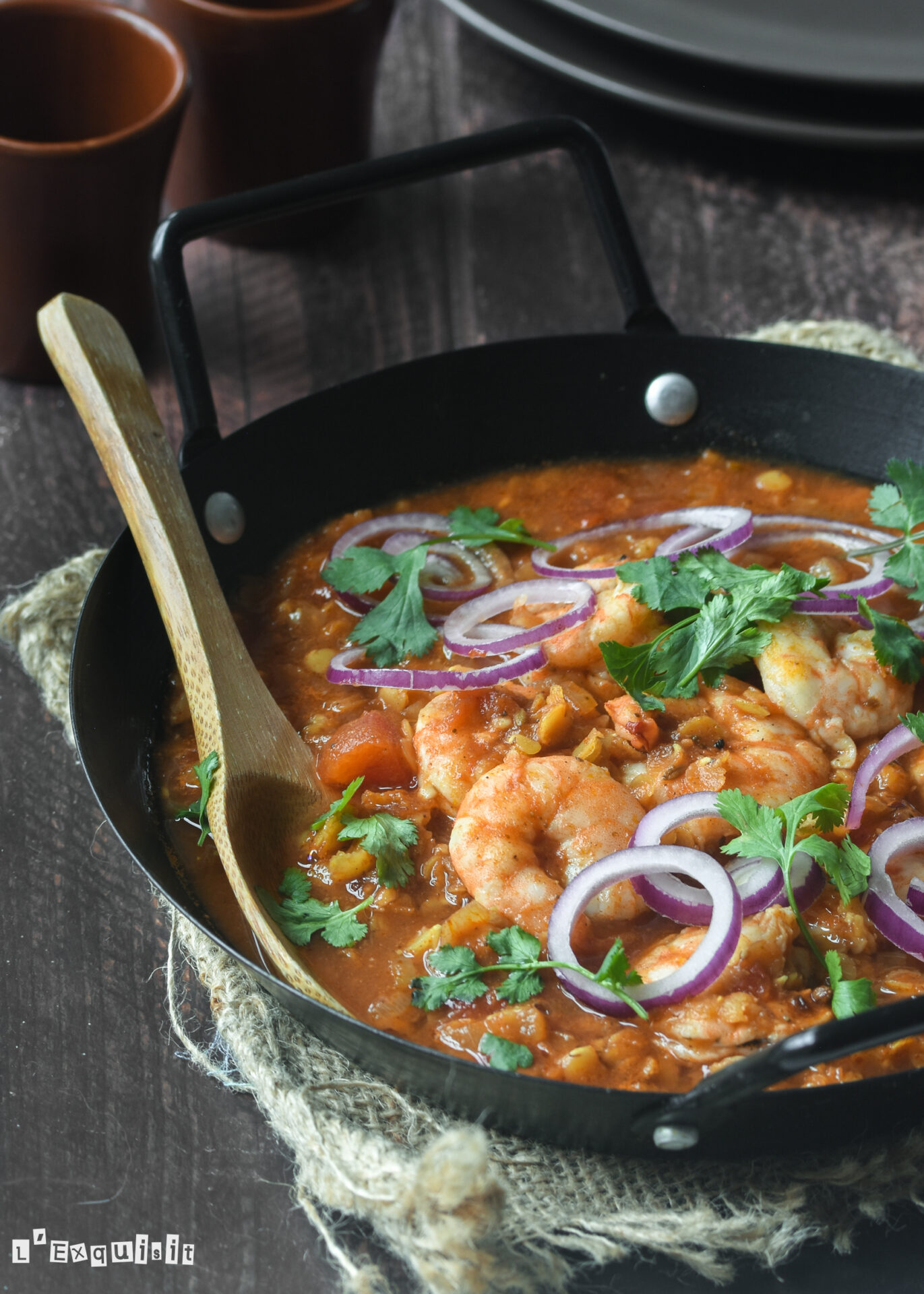 Salar las gambas, agregarlas a la cazuela y cocinar 5 minutos, hasta que cambien de color. Servir el curry con las hojas de cilantro y la cebolla roja.