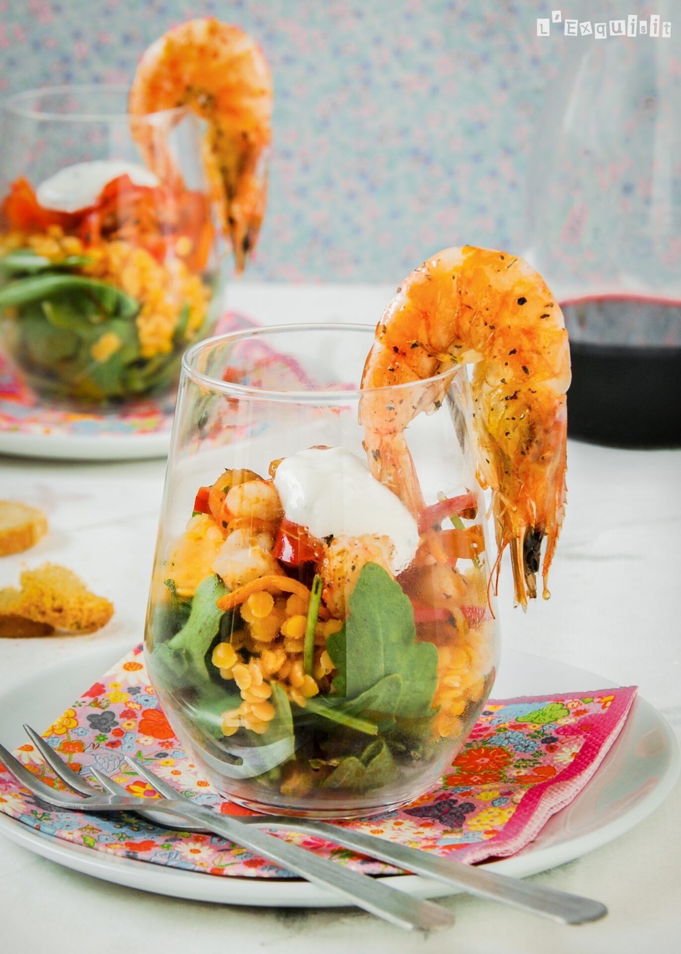 Mientras, disponer la rúcula en el fondo de los vasos, a continuación las lentejas, la mezcla de verduras con las gambas troceadas y coronar con el aliño de yogur. Colocar una gamba entera en el vaso como decoración.