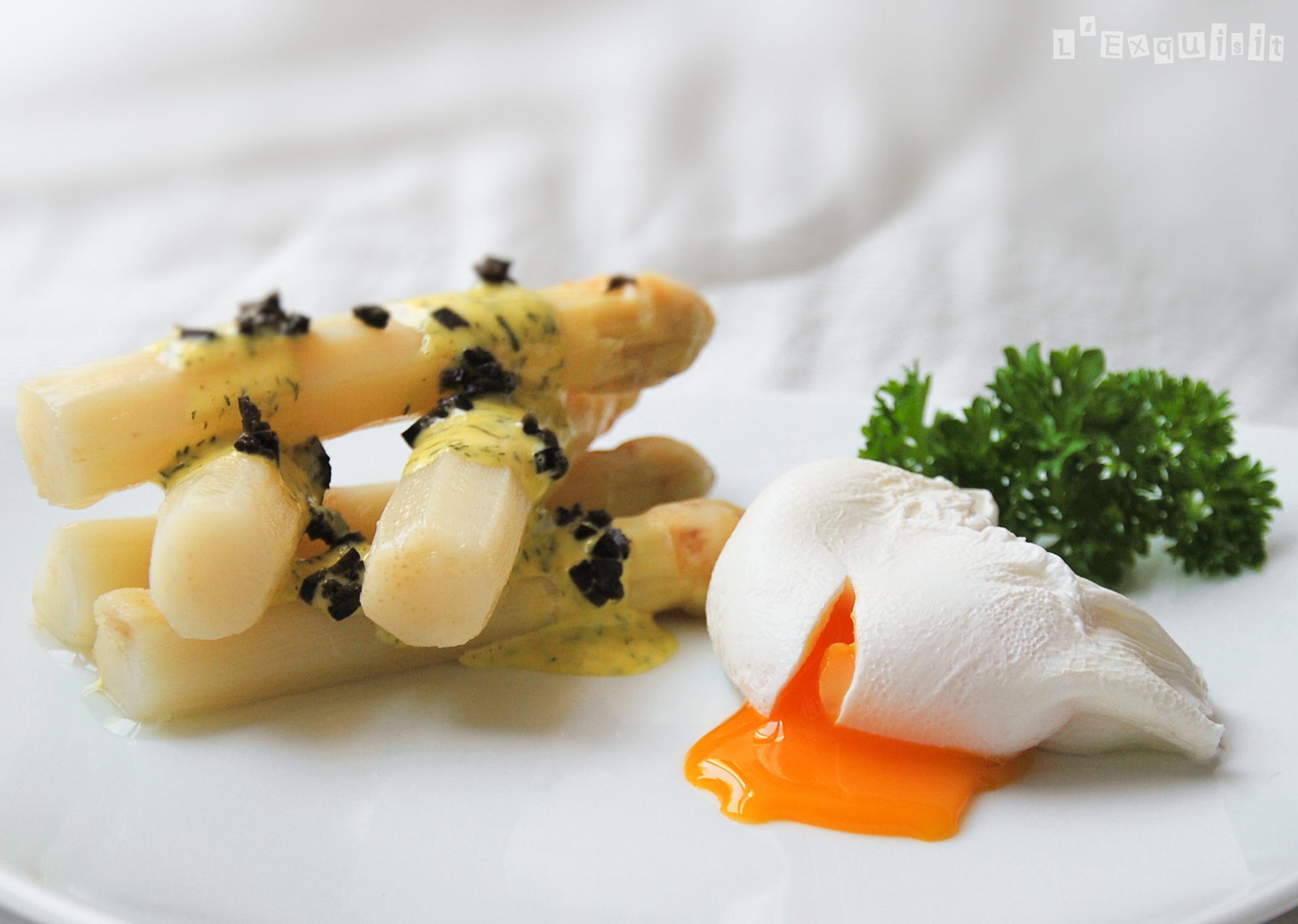 Cascar un huevo en un pequeño bol y deslizarlo en el agua. Dejar cocer un minuto, darle la vuelta con la espumadera y dejar cocer 1 minuto más. Pasar el huevo escalfado a un cuenco con agua fría, con sal (1 c/s por 1 l.), para quitar el sabor a vinagre y para evitar que la yema se termine de cocer y servirlo inmediatamente, junto con los espárragos con la mahonesa y las olivas picadas.