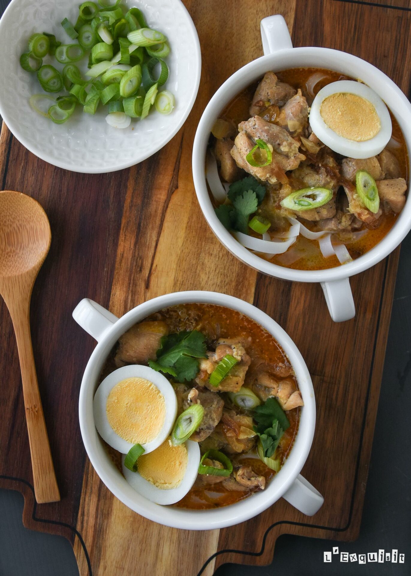 Escurrir los fideos de arroz, repartirlos en cuencos y servir la sopa junto a las cebolletas, los huevos hervidos y el cilantro.