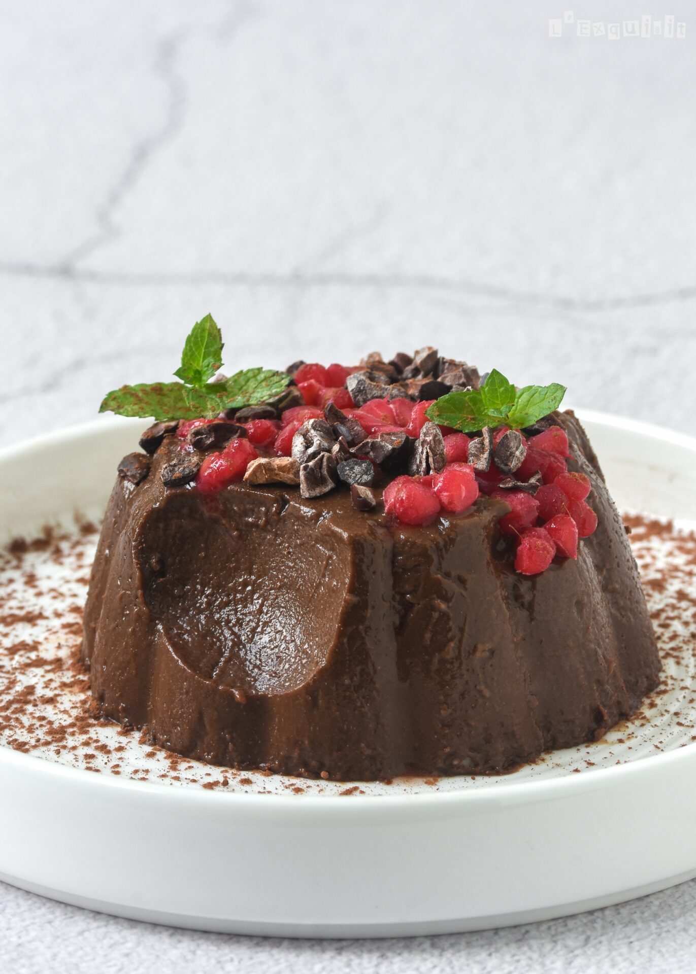Desmoldar antes de servir y decorar con frambuesas y nibs de cacao.