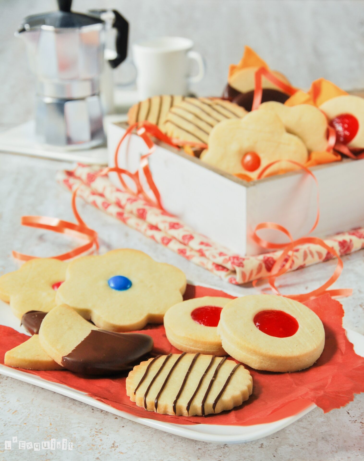 Galletas rellenas: sacar una forma redonda y otra del mismo tamaño, pero con un agujero en el centro. Disponer ésta encima y hornear tal como se indica. Cuando estén frías, rellenar con mermelada de fresa triturada y mezclada con una hoja de gelatina.