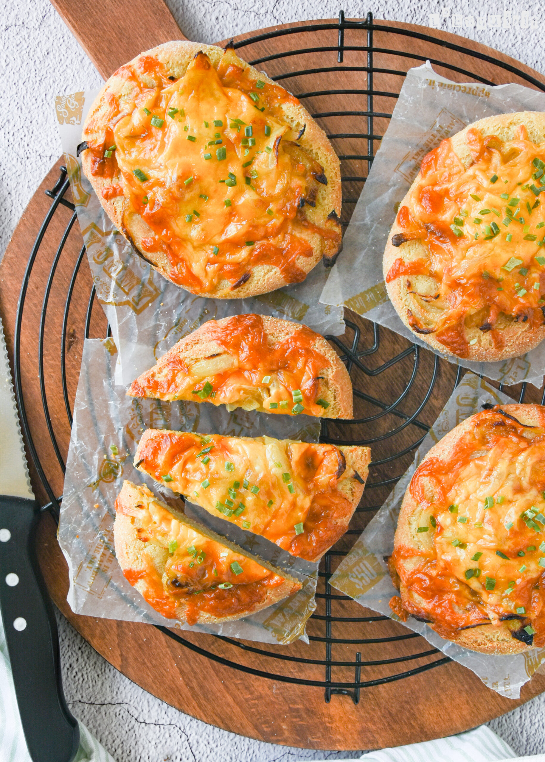 Calentar el aceite en una sartén y sofreír las cebollas durante 20 minutos a fuego muy bajo. Repartir sobre el pan y cubrir con el queso.