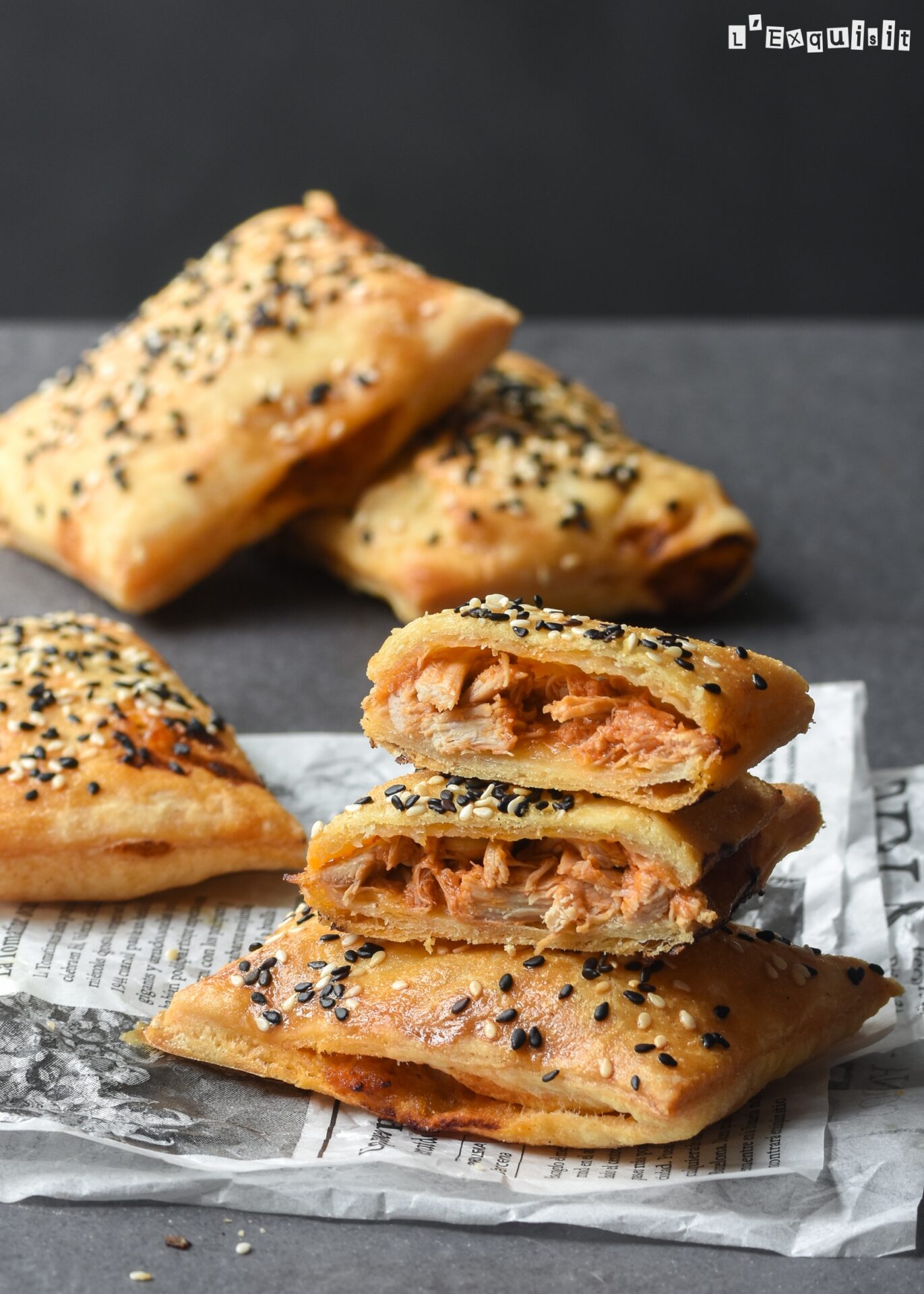 Disponer los rectángulos sobre una bandeja forrada con silpat o papel sulfurizado. Repartir el pollo sobre 6 hojaldres dejando un espacio en los bordes. Pintar el borde con el huevo batido y cubrir con el resto de hojaldre. Pintar los paquetitos con el huevo y espolvorear con el sésamo o amapola.