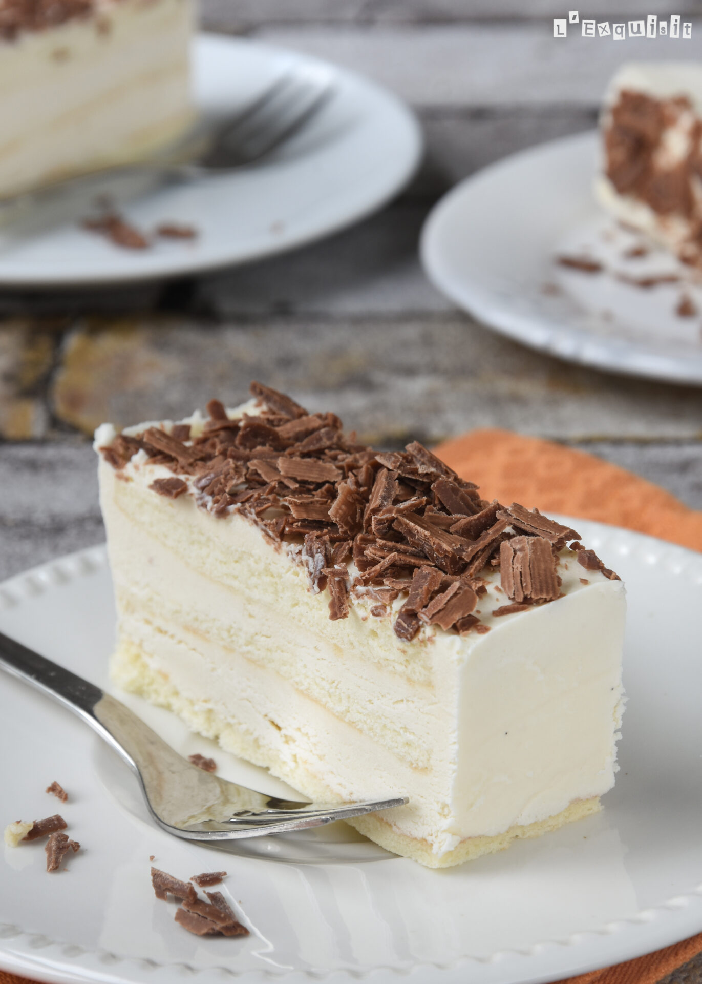 Disponer una base de biscuit en el molde forrado con film transparente (para desmoldar mejor), la tercera parte de la crema, biscuit, la otra tercera parte de la crema, biscuit y terminar con el resto de la crema. Cubrir con virutas de chocolate. Congelar.