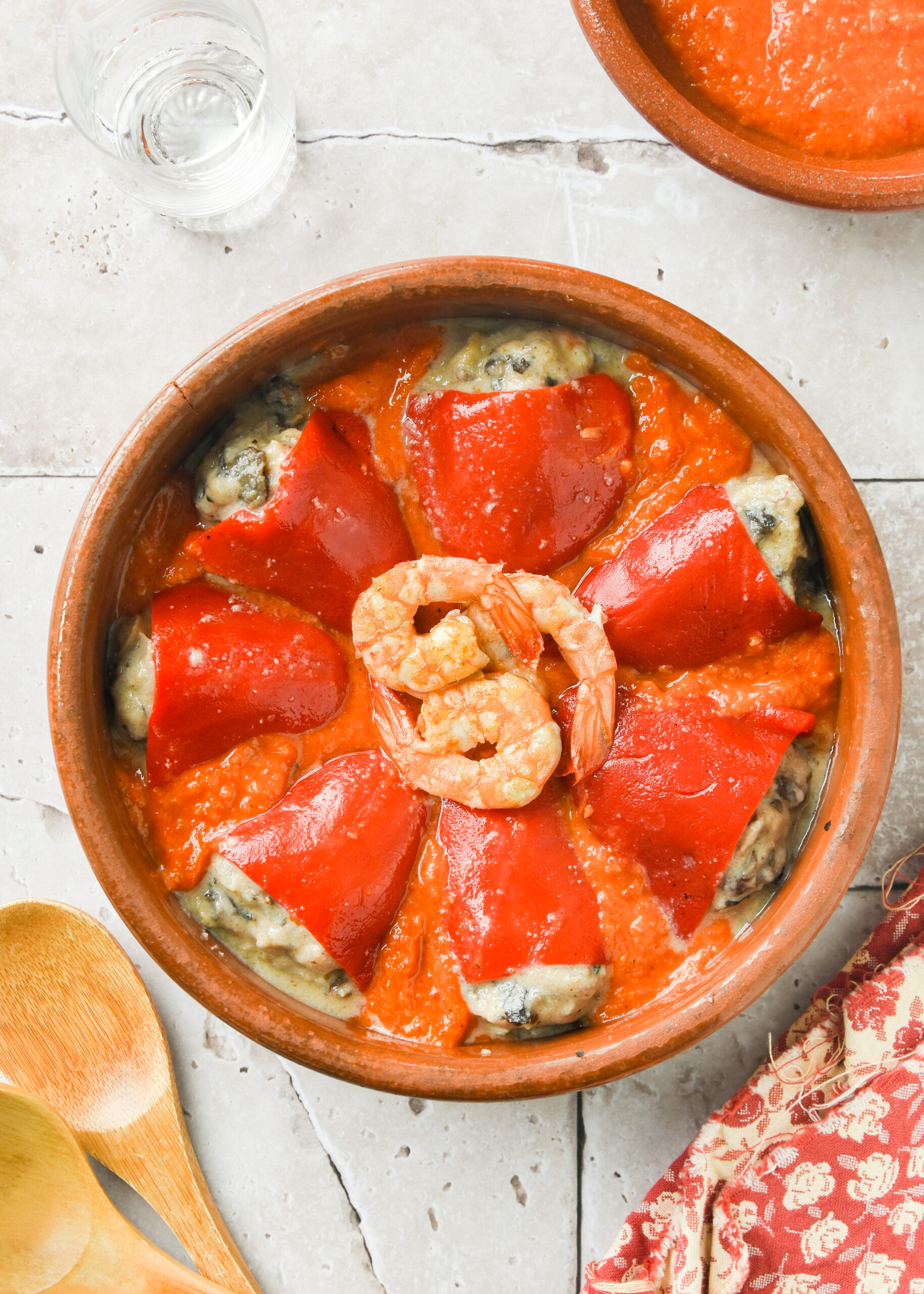 Rellenar los pimientos del piquillo con el relleno de gambas que habíamos reservado en la manga pastelera. Disponer en una cazuela, cubrir con la salsa y calentar en el horno a 180 grados durante 15 minutos.