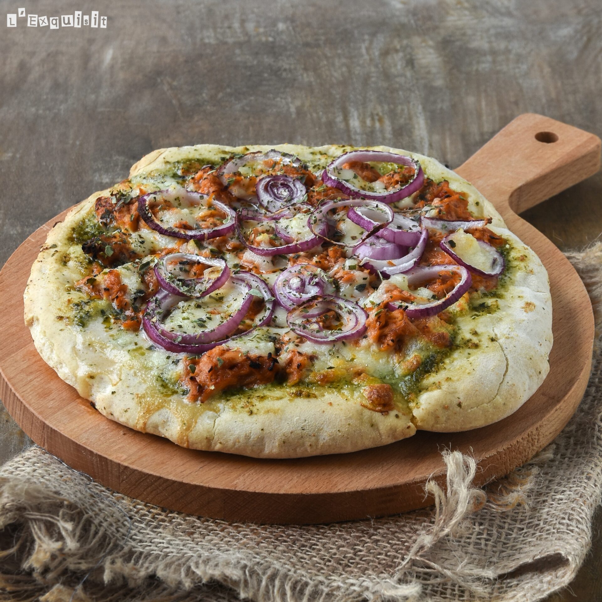 Pintar la pizza con el pesto, repartir el pollo y la cebolla por encima. Cubrir con el queso rallado y condimentar con el orégano.