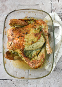 Retirar el pollo del horno y dejar reposar 5 minutos antes de servir.
