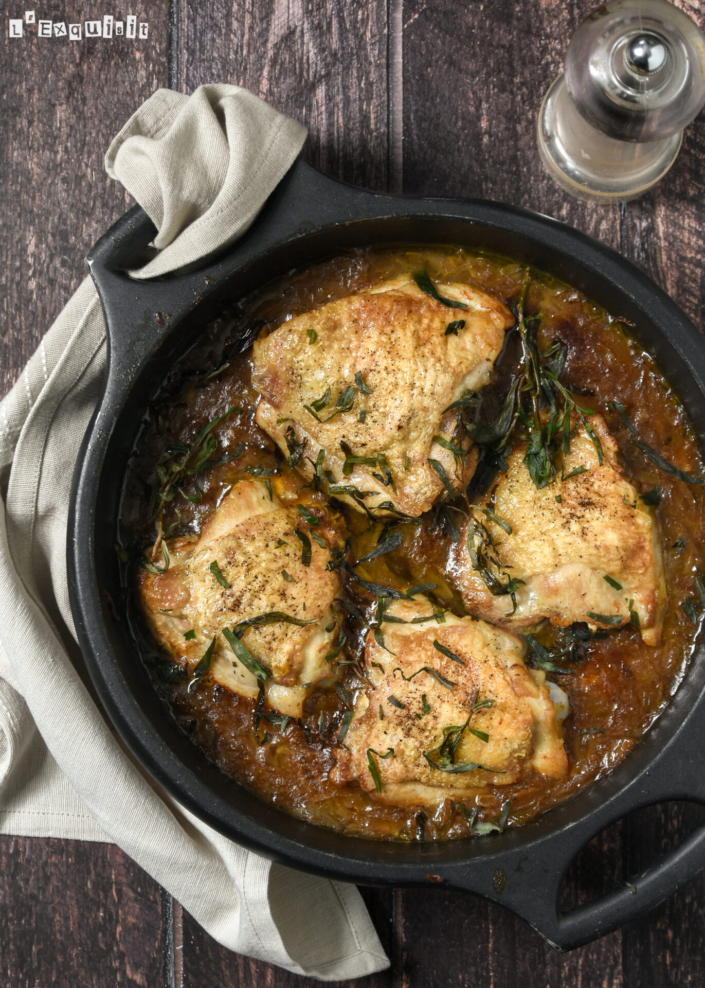 Mientras, calentar el aceite en una sartén y dorar el pollo salpimentado durante 4-5 minutos. Disponer, con la piel hacia arriba, sobre las cebollas en la cazuela. Hornear a 220 grados durante 15 minutos. Añadir las hojas de estragón picadas y cocinar 5 minutos más, hasta que el pollo esté hecho. Salpimentar y servir.