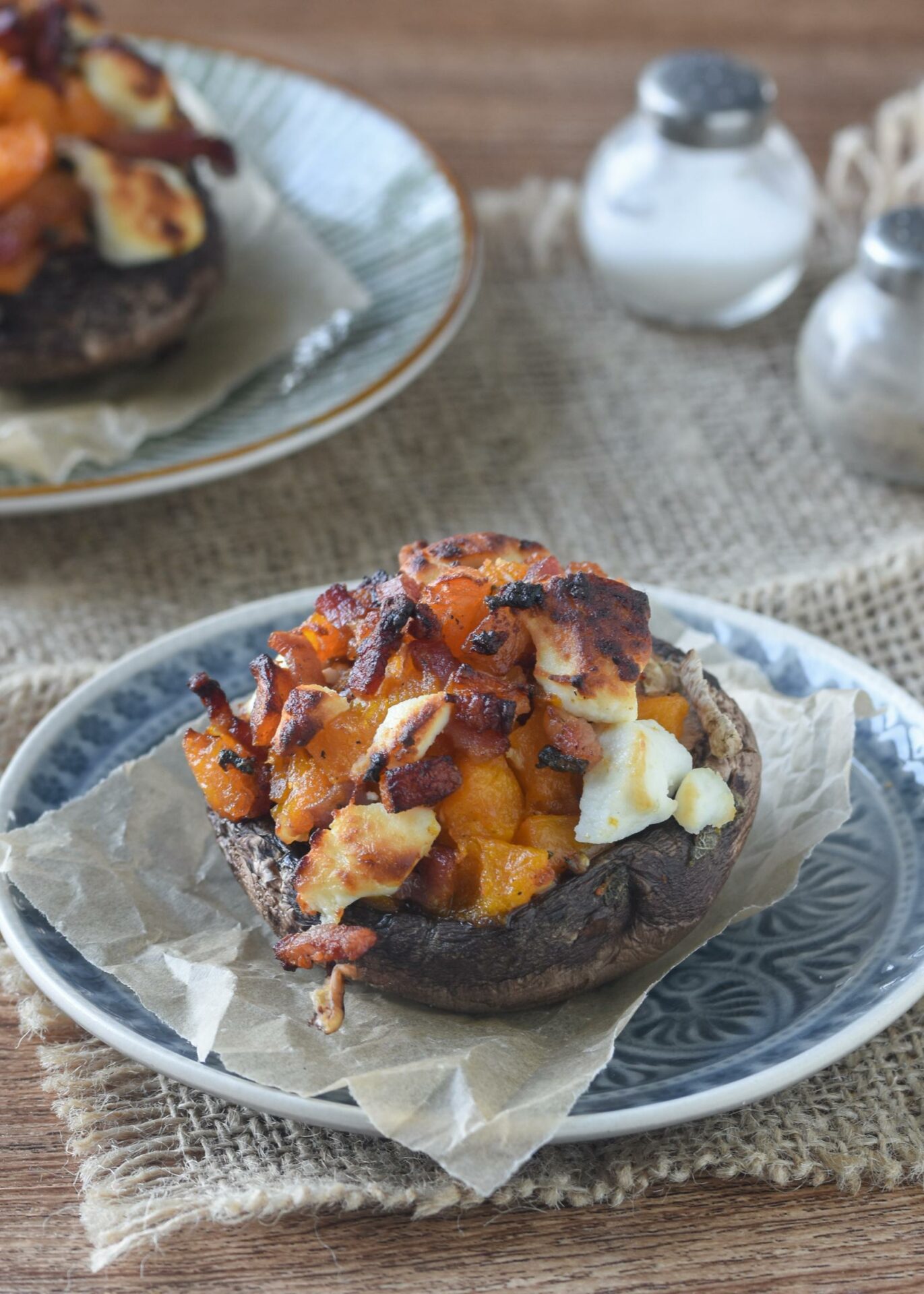 Pintar los Portobello con aceite y hornear durante 20 minutos (o en airfryer durante 10-15 minutos). Este paso se puede hacer con la calabaza en el horno en el mismo momento.