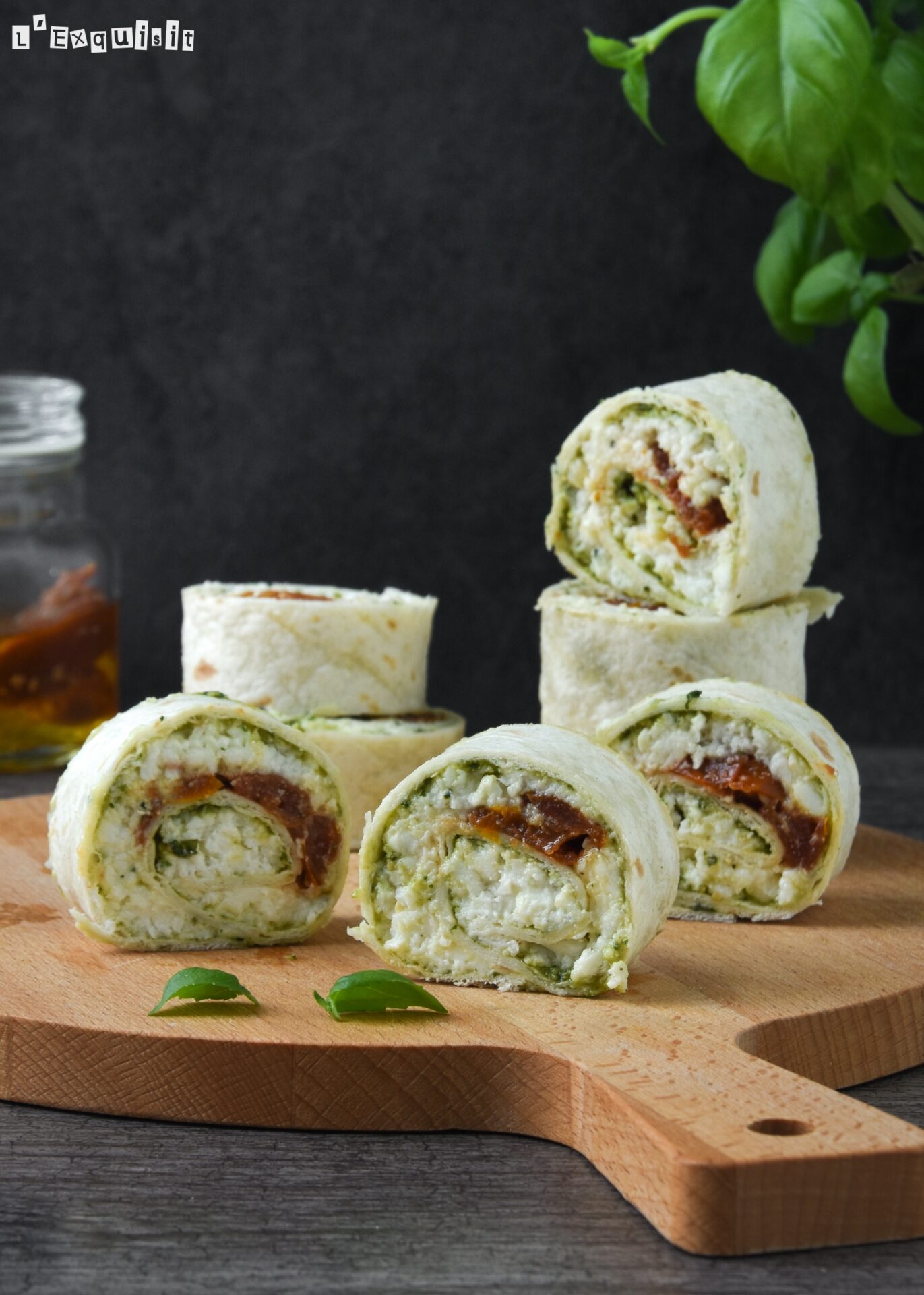 Extender sobre la tortilla (un cuadrado, después desecharemos los extremos) el pesto, y encima disponer la mozzarella. En el centro repartir los tomates y los piñones. Pimentar. Enrollar y cortar en 8 porciones.