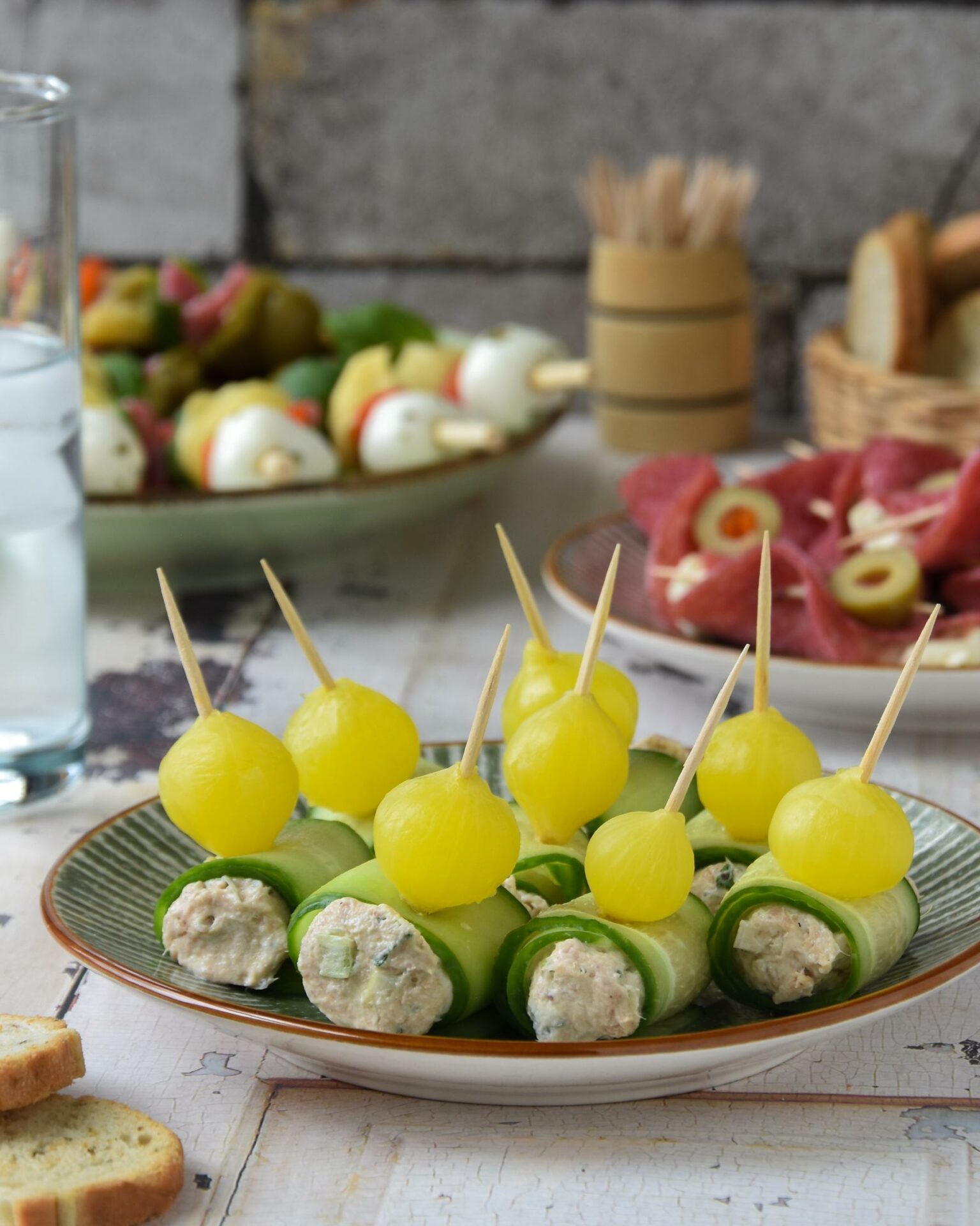 Un aperitivo fácil, que se puede hacer con antelación y con una combinación muy buena: la suavidad del relleno con el contraste del pepino y las cebollitas, no dejéis de probarlo!
