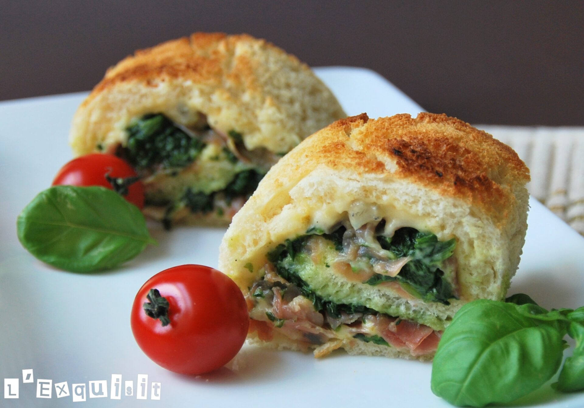 Untar las dos rebanadas de pan con la bechamel, cubrir con el jamón y repartir encima las espinacas. Enrollar apretando, por la parte más corta y disponer los dos rollitos en una bandeja enmantequillada.