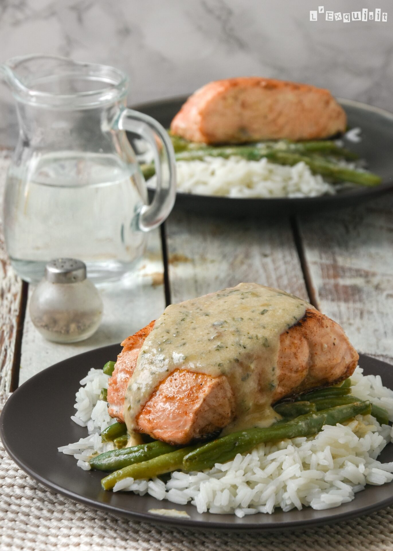 Servir el salmón encima de una cama de arroz y judías. Presentar la salsa aparte para que cada comensal se sirva al gusto.