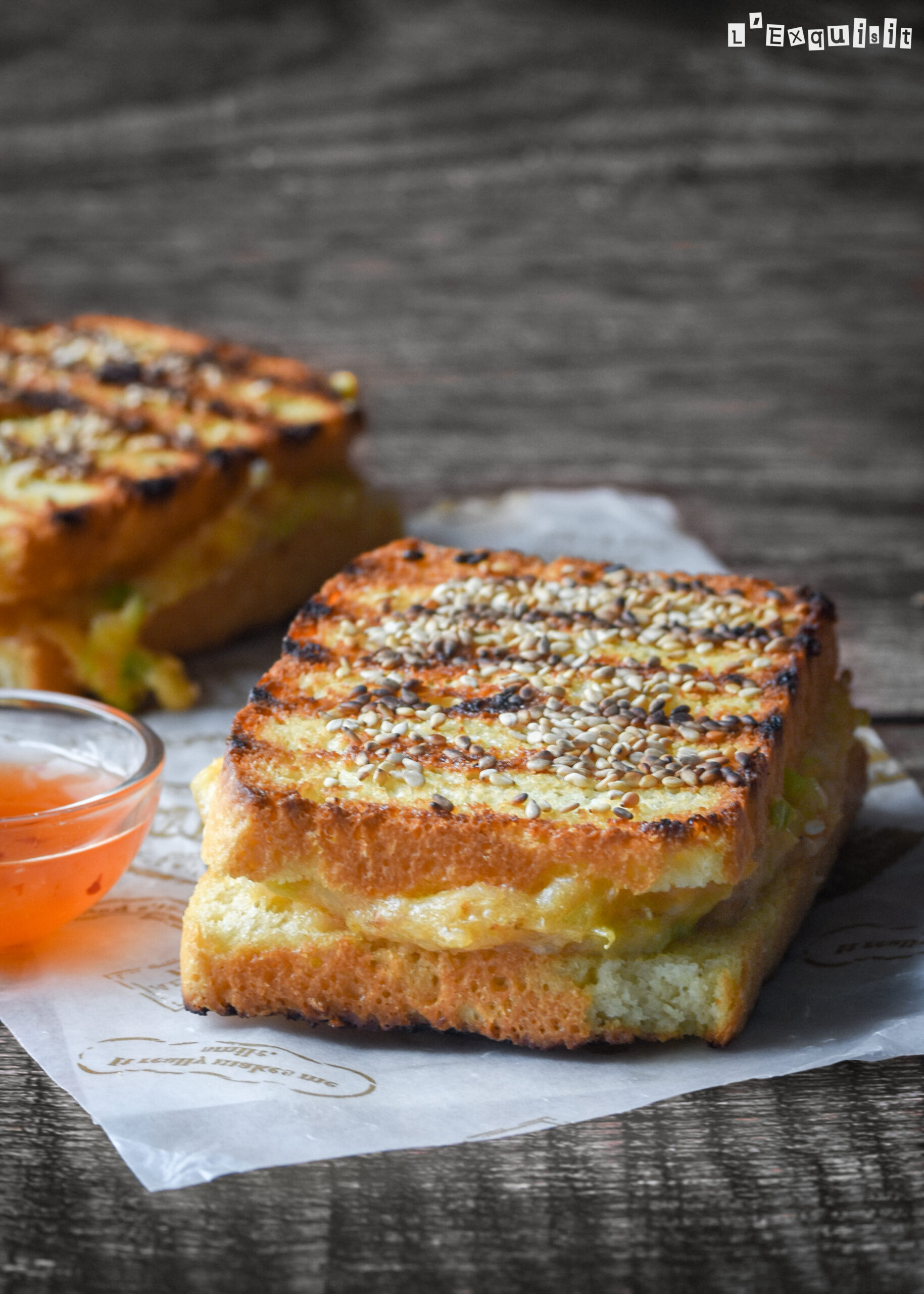 Mezclar en un cuenco las cebolletas con las gambas, el jengibre, la salsa de soja y la yema. Reparte sobre dos rebanadas de pan y tapa con las otras dos.