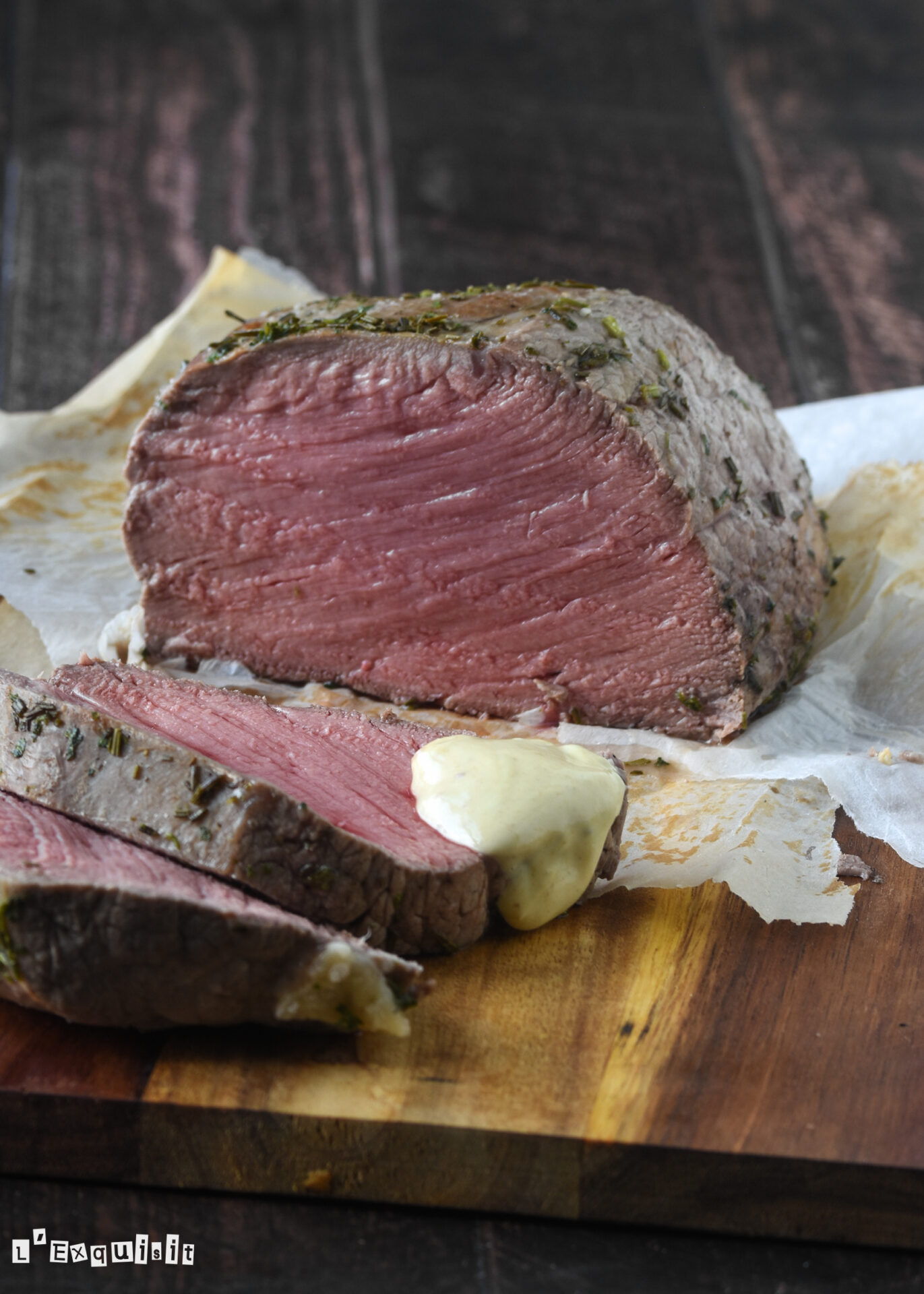 Disponer la carne en una bandeja para horno forrada con papel sulfurizado, con el cierre hace arriba y hornear a 200 grados durante 30 minutos. Retirar del horno y dejar reposar 20 minutos. Romper la costra de sal y cortar la carne en rodajas gruesas. Servir con la mahonesa.