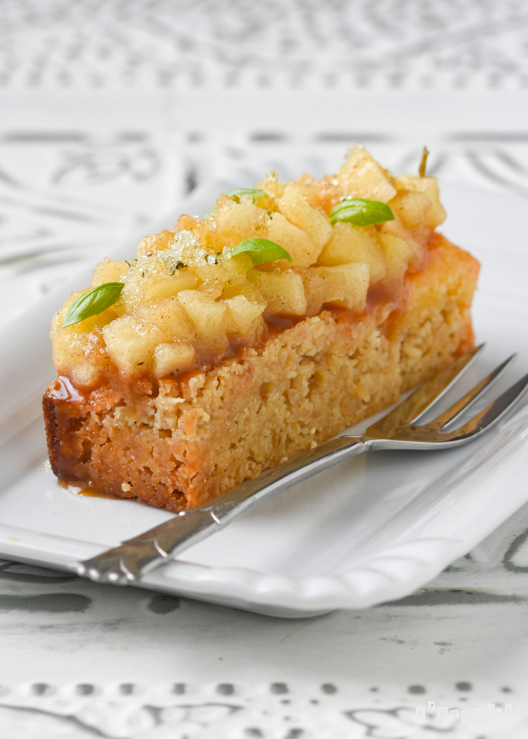 Antes de servir, repartir una capa de caramelo salado (con manga pastelera es más fácil) encima de la base enfriada y cubrir con los daditos de manzana.