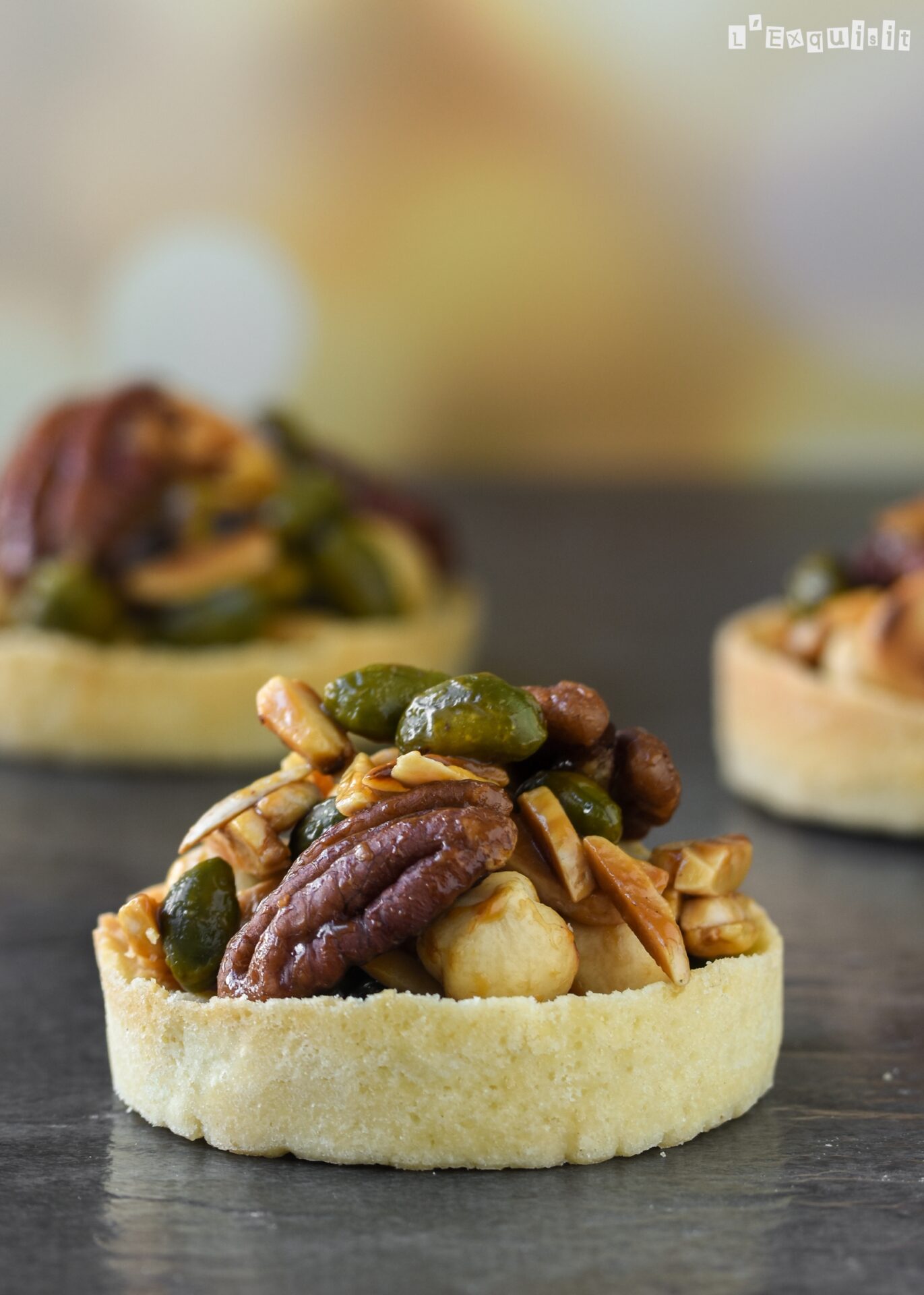 Repartir una fina capa de salsa de caramelo salado en las bases de las tartaletas (mejor hacerlo con una manga pastelera) y repartir las nueces encima.