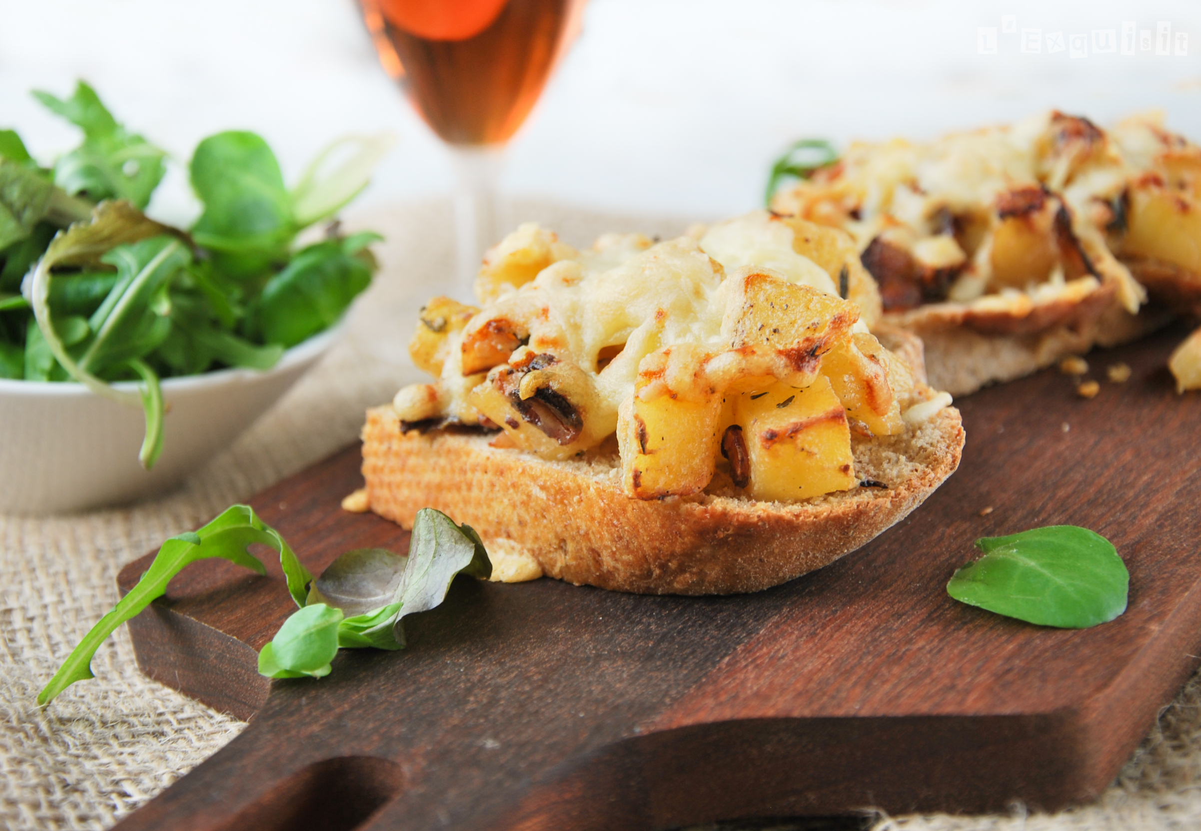 Repartir las patatas sobre el pan y gratinar en el horno hasta que el queso quede fundido. Servir inmediatamente acompañado de una ensalada variada.