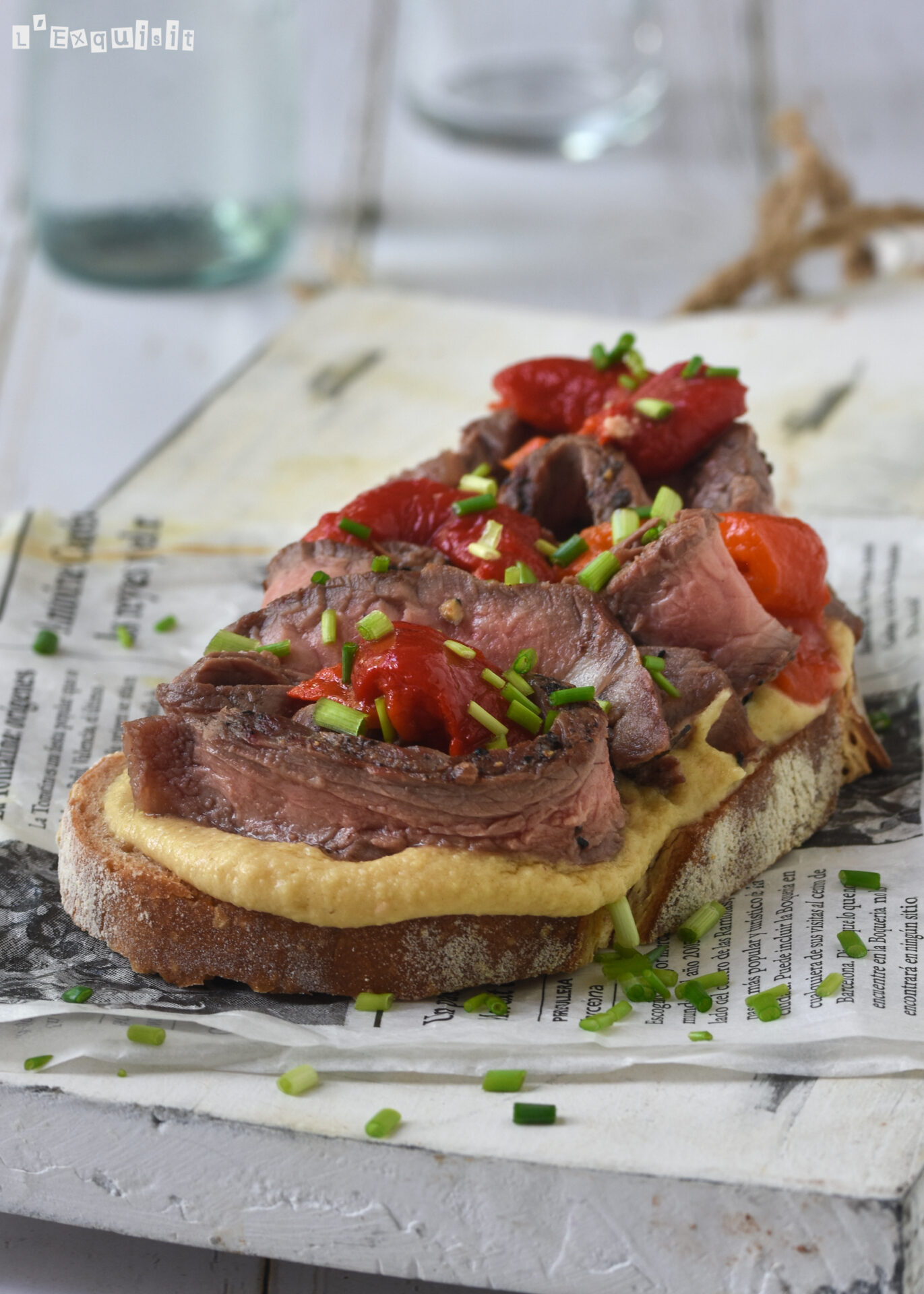 Como tantos bocadillos publicados en este blog, este nació con restos. Después de un fin de semana de barbacoa, sobró ribeye y para darle salida fui a buscar los otros ingredientes en el congelador (siempre tengo para un caso de prisas), y salió esta deliciosa tostada…