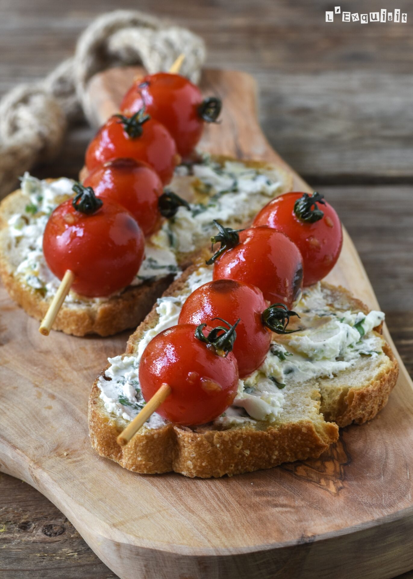 Mientras, dorar los tomates (4 unidades ensartados en un palillo de madera) en una sartén (o en la barbacoa) durante 3-4 minutos, girándolos. Servir encima del pan.