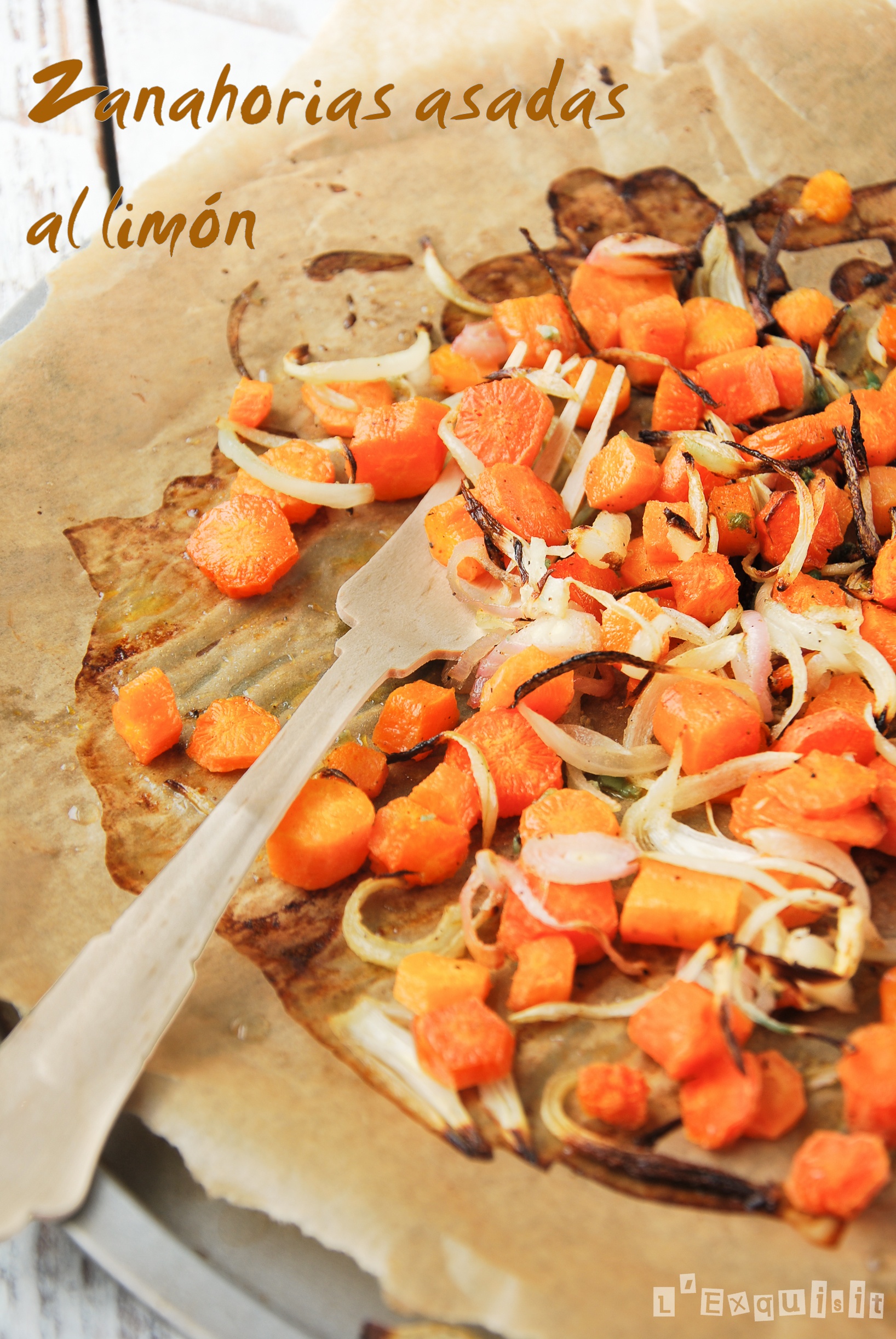 Mezclar el zumo de limón con el aceite, el comino y la pimienta. Verter sobre las zanahorias, las cebollas y el ajo. Mezclar bien y disponer sobre una bandeja forrada con silpat o papel sulfurizado.